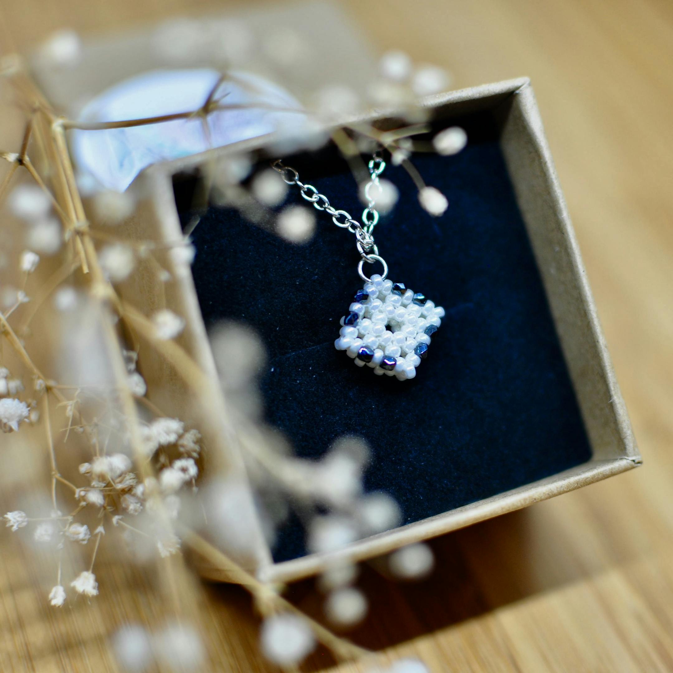 Delicately handmade from tiny Japanese glass seed beads and Czech fire-polished crystals, and stitched together with needle and thread. Necklace chain and findings are quality silver-plated
