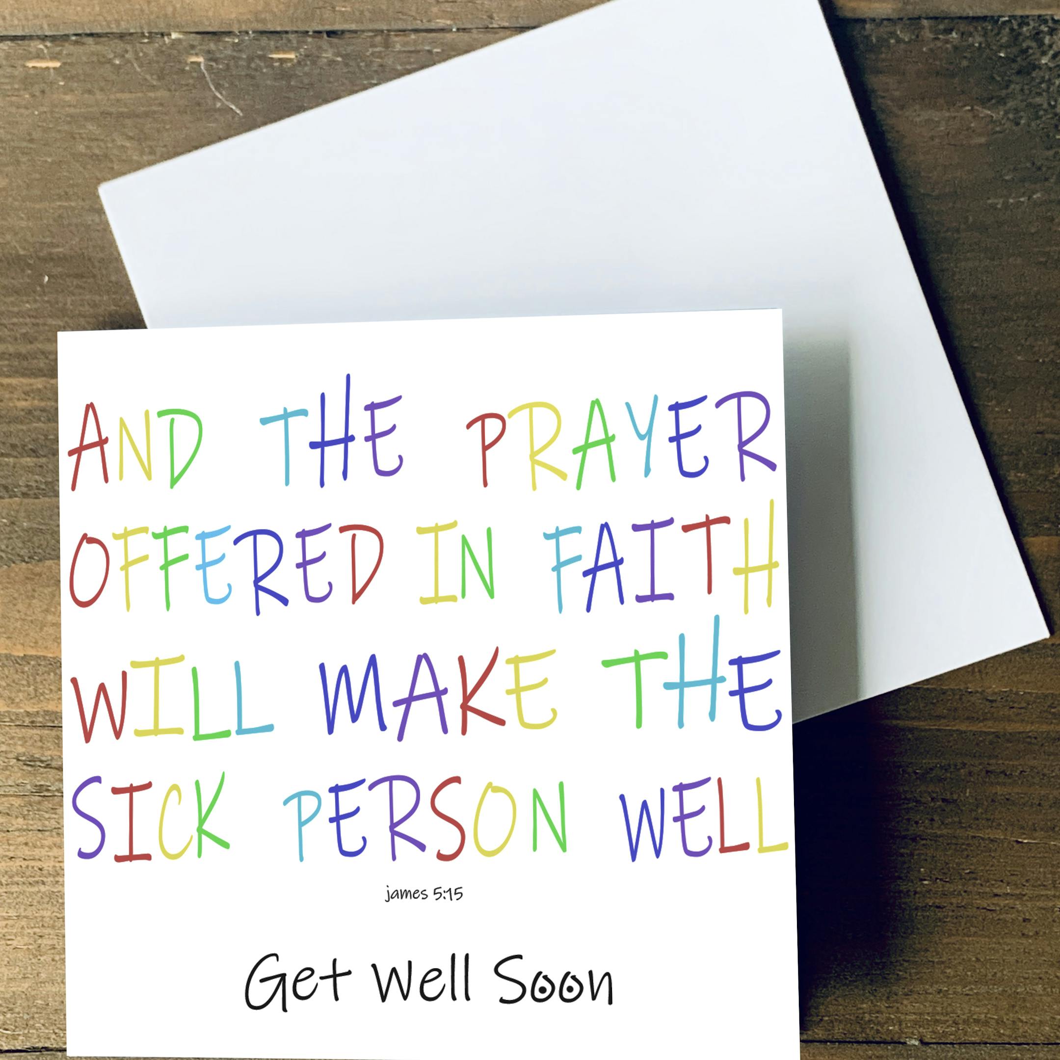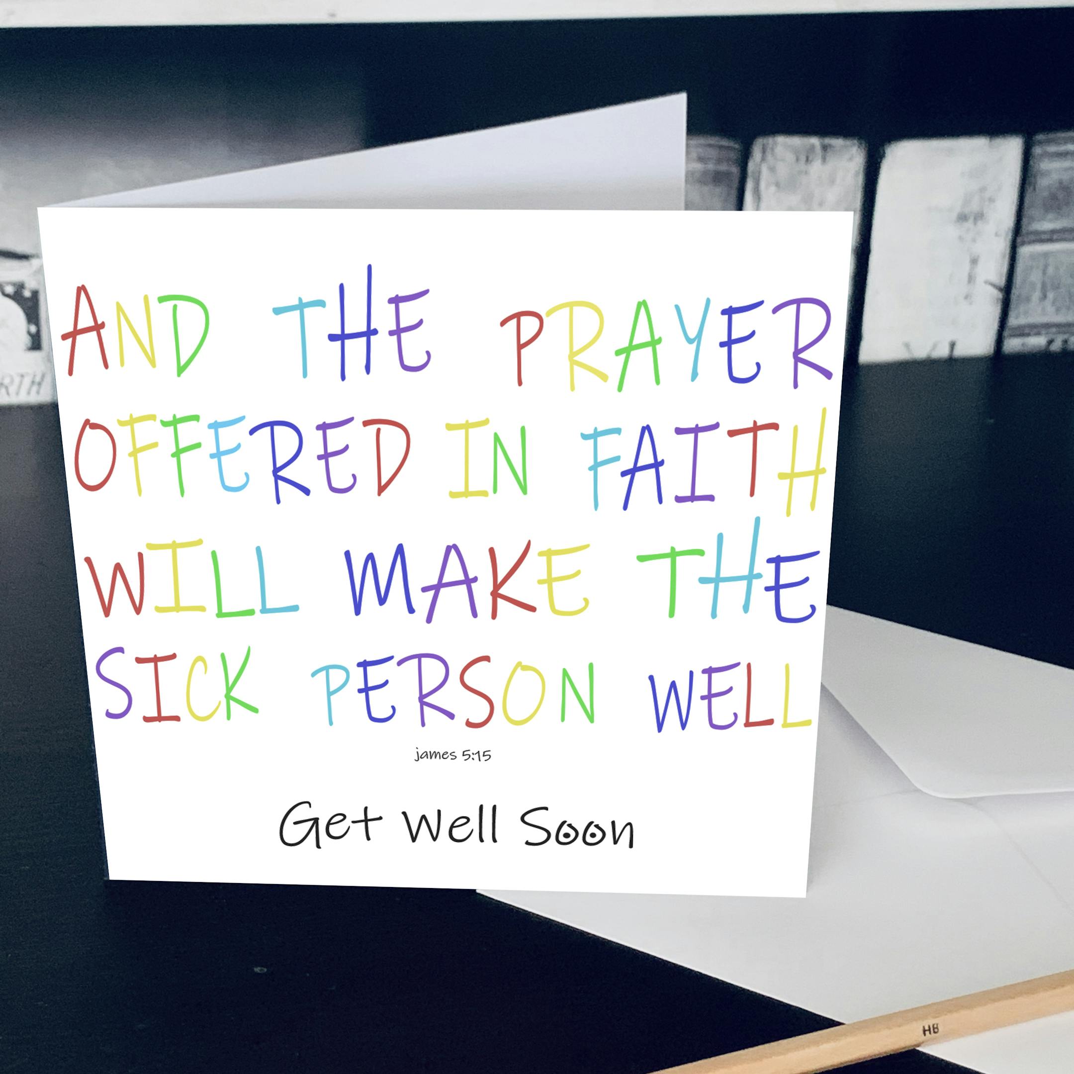 A contemporary get well soon card with the verse by James 5:15 “And the prayer offered in faith will make the sick person well”.