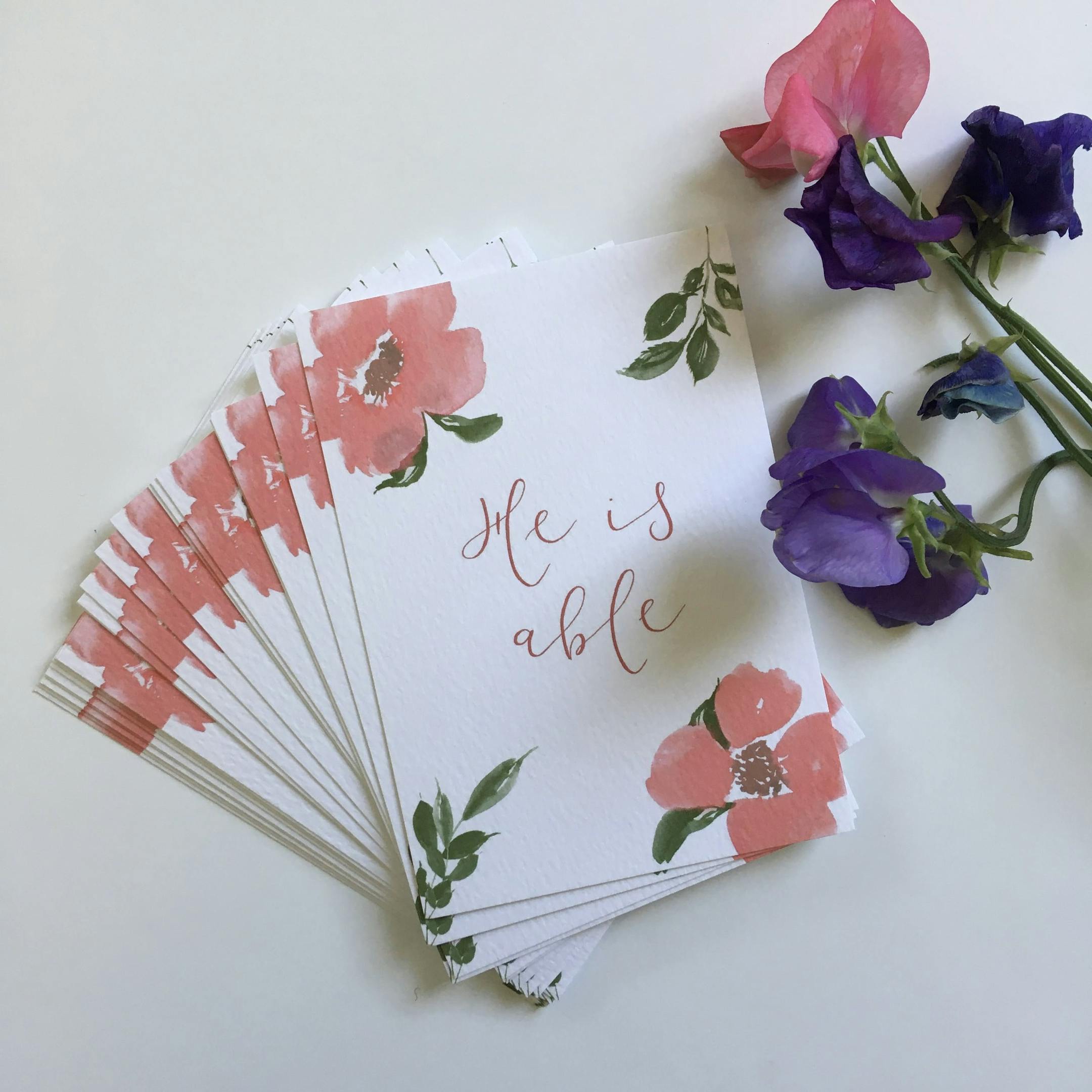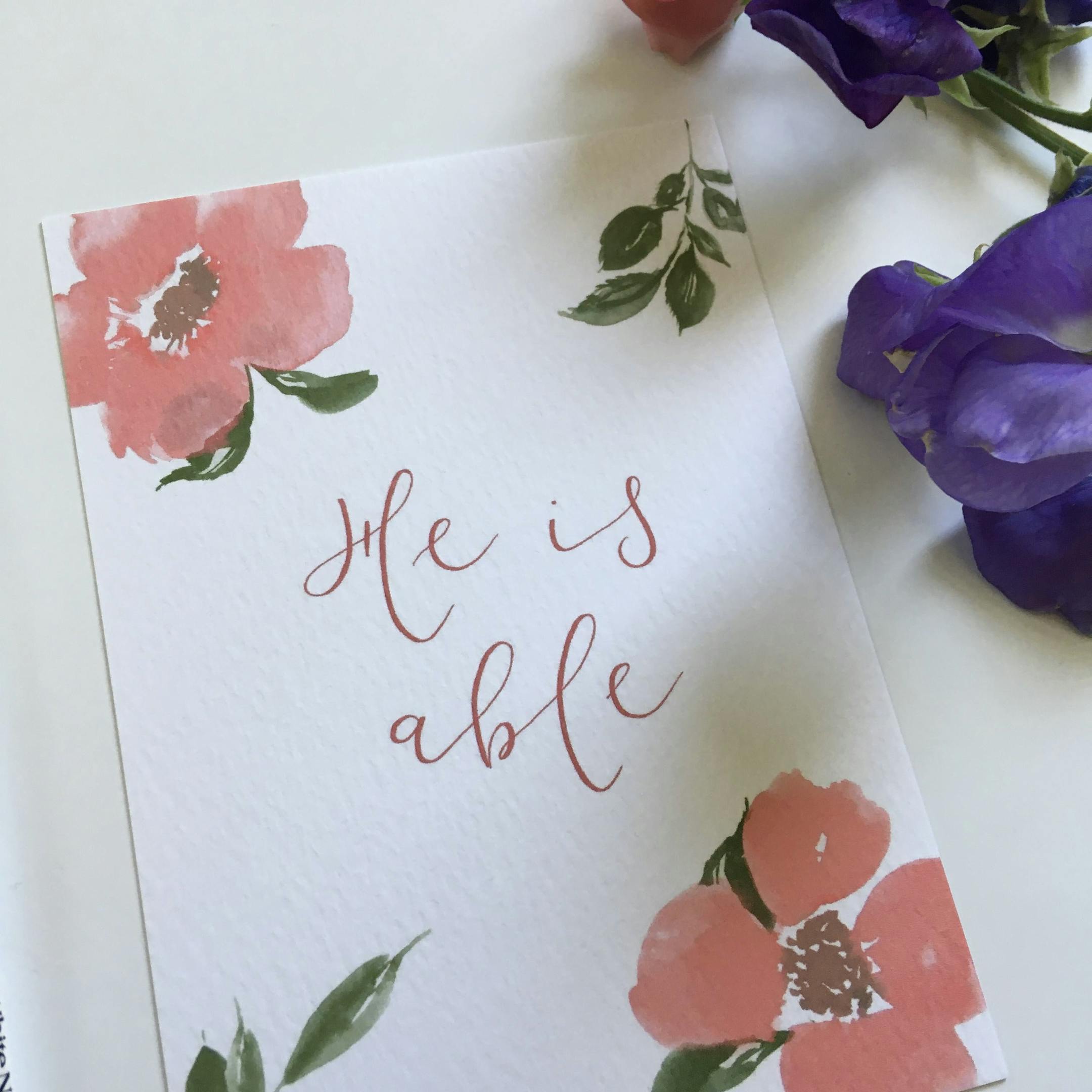 The front of the postcard is hand lettered with ‘he is able’ which is a great reminder no matter the occasion.