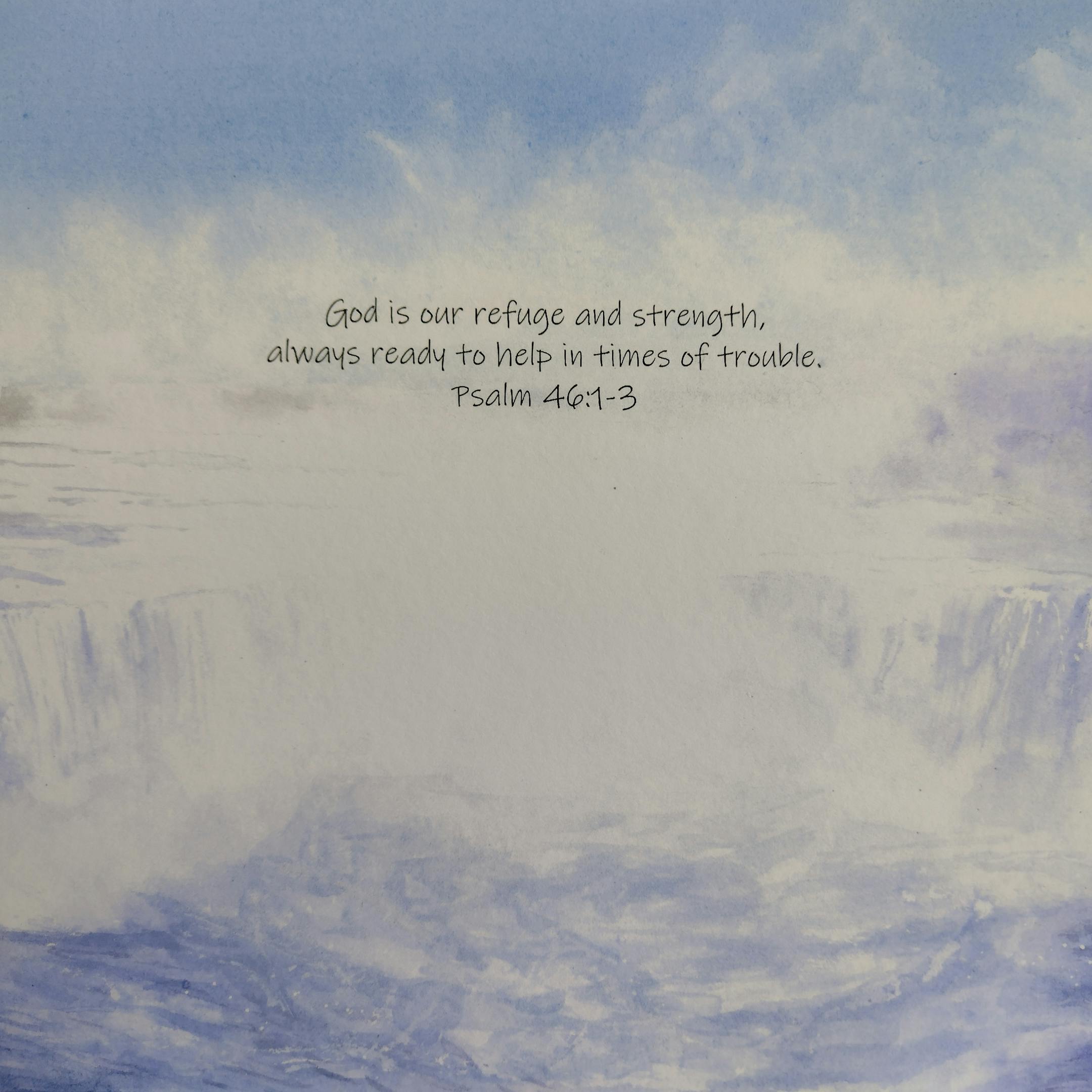 This is a print of my original watercolour painting of the magnificent Niagra Falls, a place of astonishing power and beauty. I felt it was an apt landscape to hold the wonderful promise of God in Psalm 46 God is our refuge and strength, always ready to help in times of trouble.
