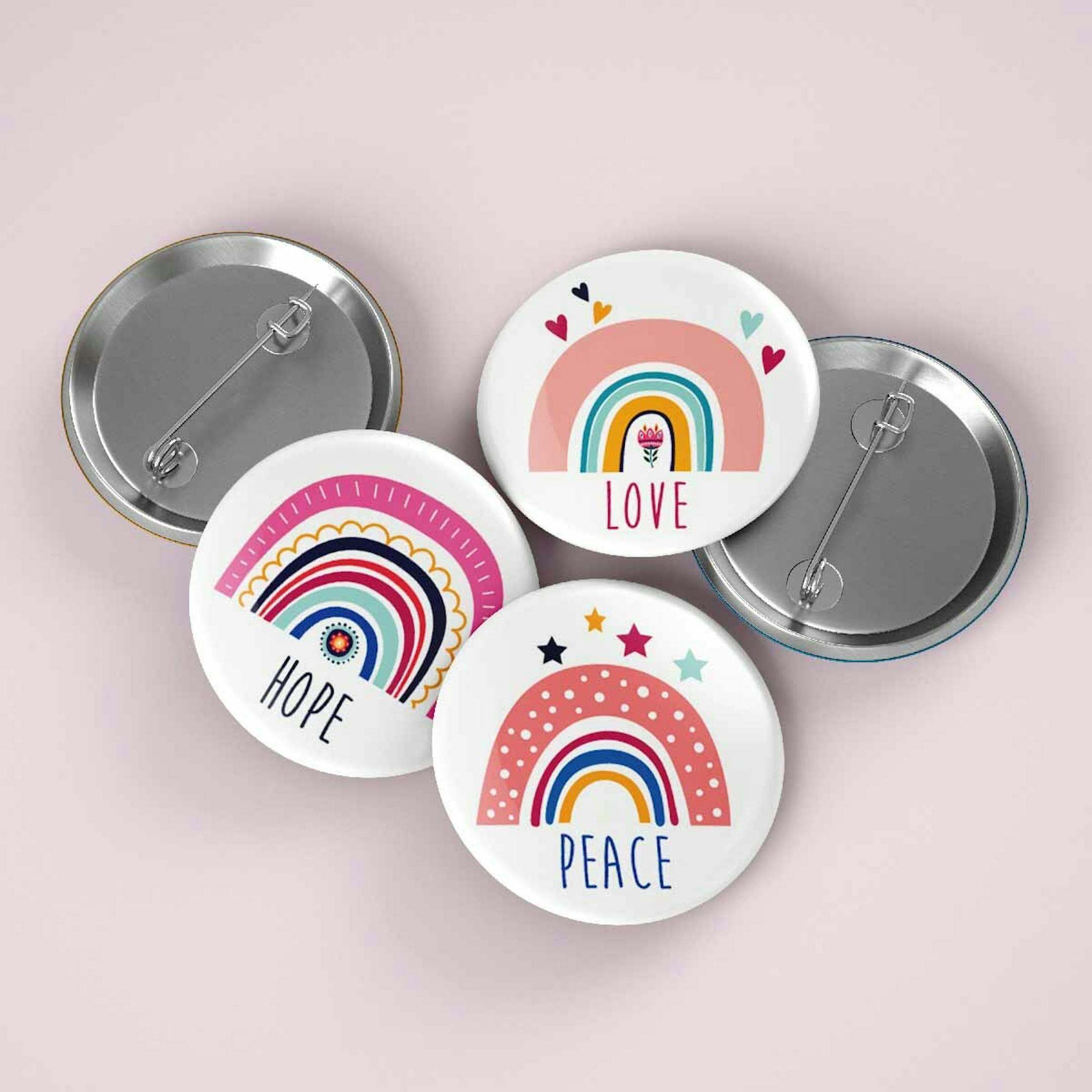 Bright, bold colours on a simple white background, make these little rainbows jump out at you. Easy to wear pin badges that are suitable for clothing, bags, hats, scarves etc. All 5 are sold together and are supplied in a cute little white draw string bag. They make a fantastic stocking filler.