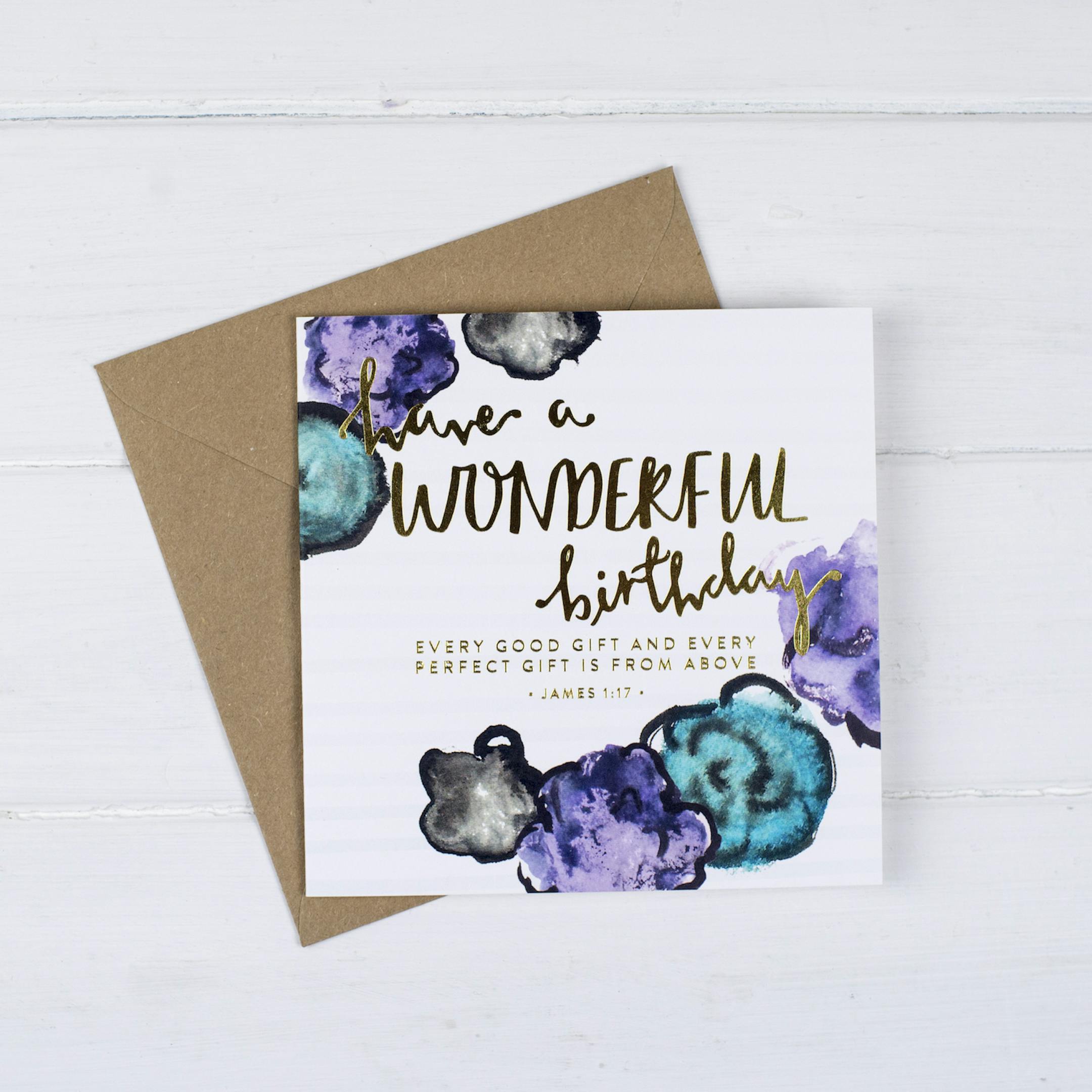 "Every good and perfect gift is from above" from James 1:17 are the words at the heart of this beautiful Bible verse birthday card. A great birthday card for her, it features original watercolour illustrations alongside black and gold modern calligraphy and typographic detail.
