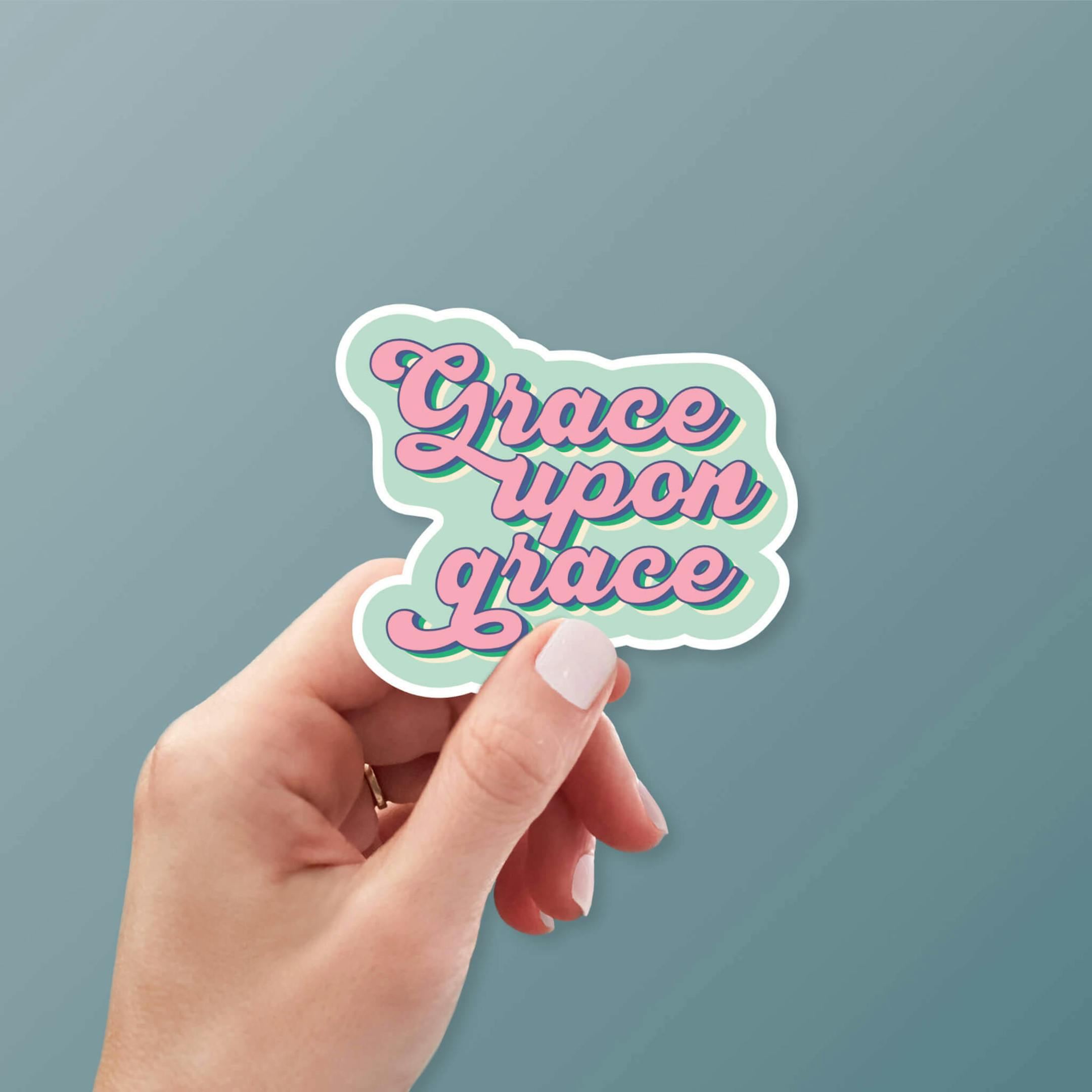 A shiny vinyl sticker with the words “Grace upon grace” in retro font on a teal background.