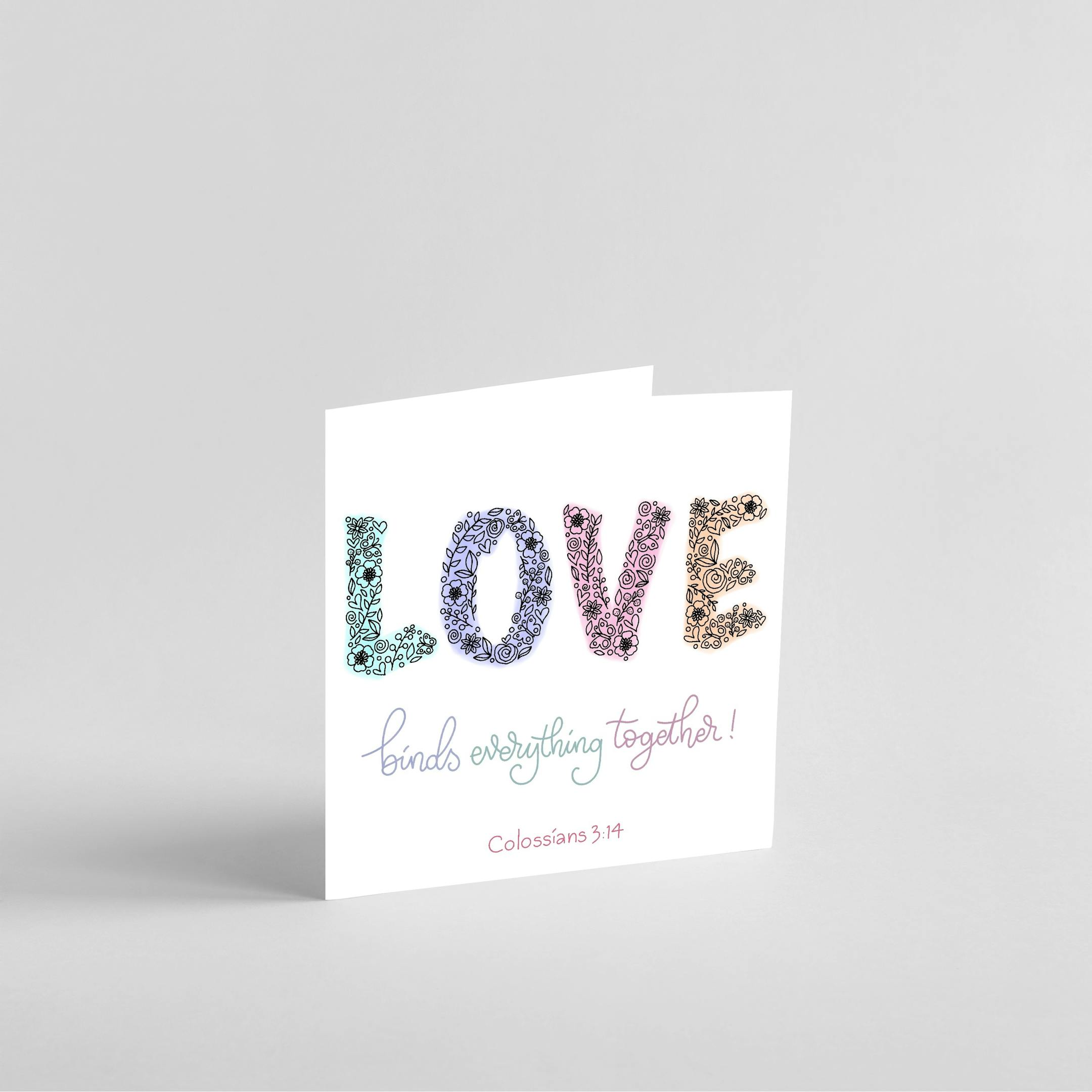 This hand lettered card is based on the lovely Bible verse in Colossians 3:14. Intricate floral designs have been woven into the words love.
