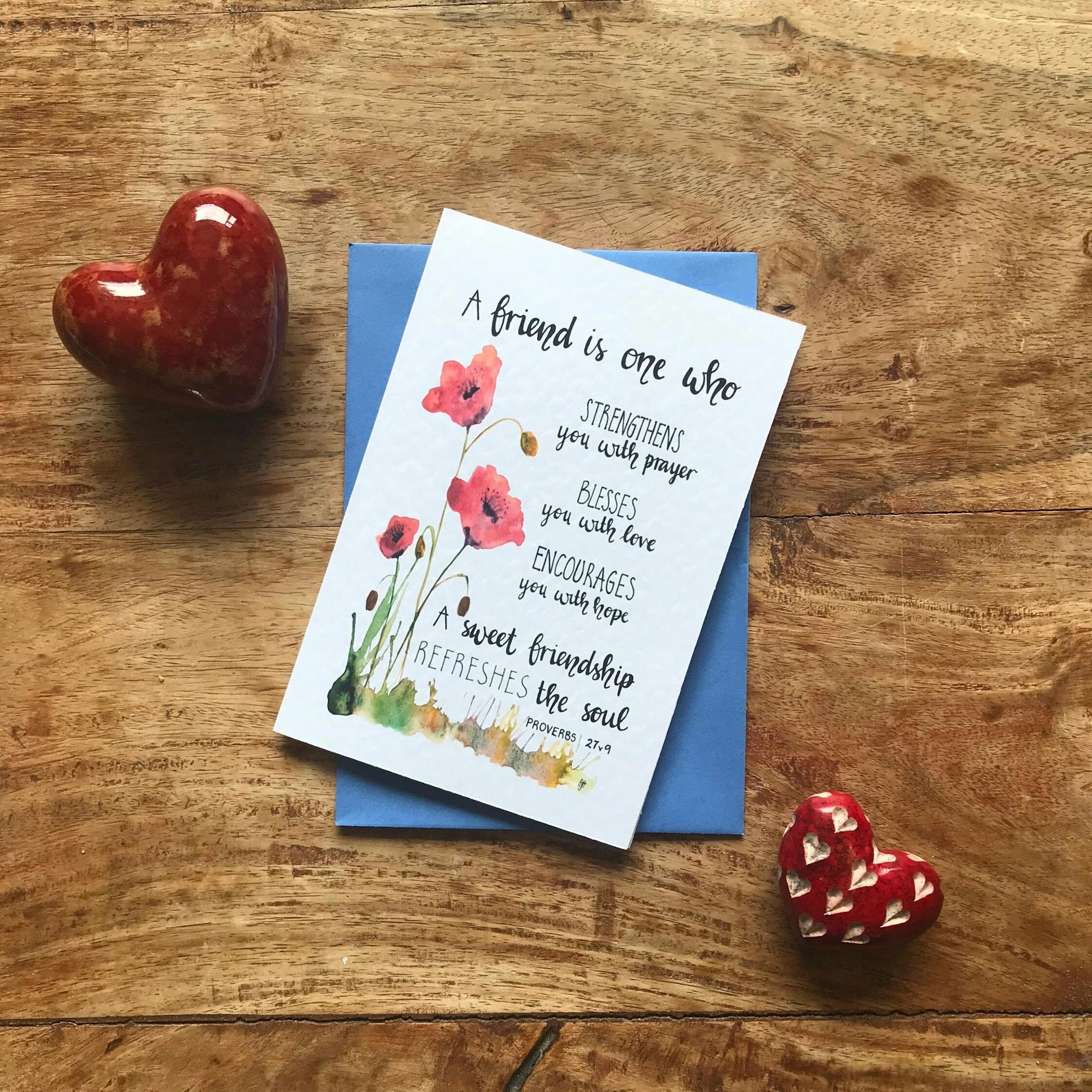 Beautiful hand lettered card. Proverbs 27:9, 'A friend is one who strengthens you with prayer, blesses you with love, encourages you with hope. A sweet friendship refreshes the soul.'