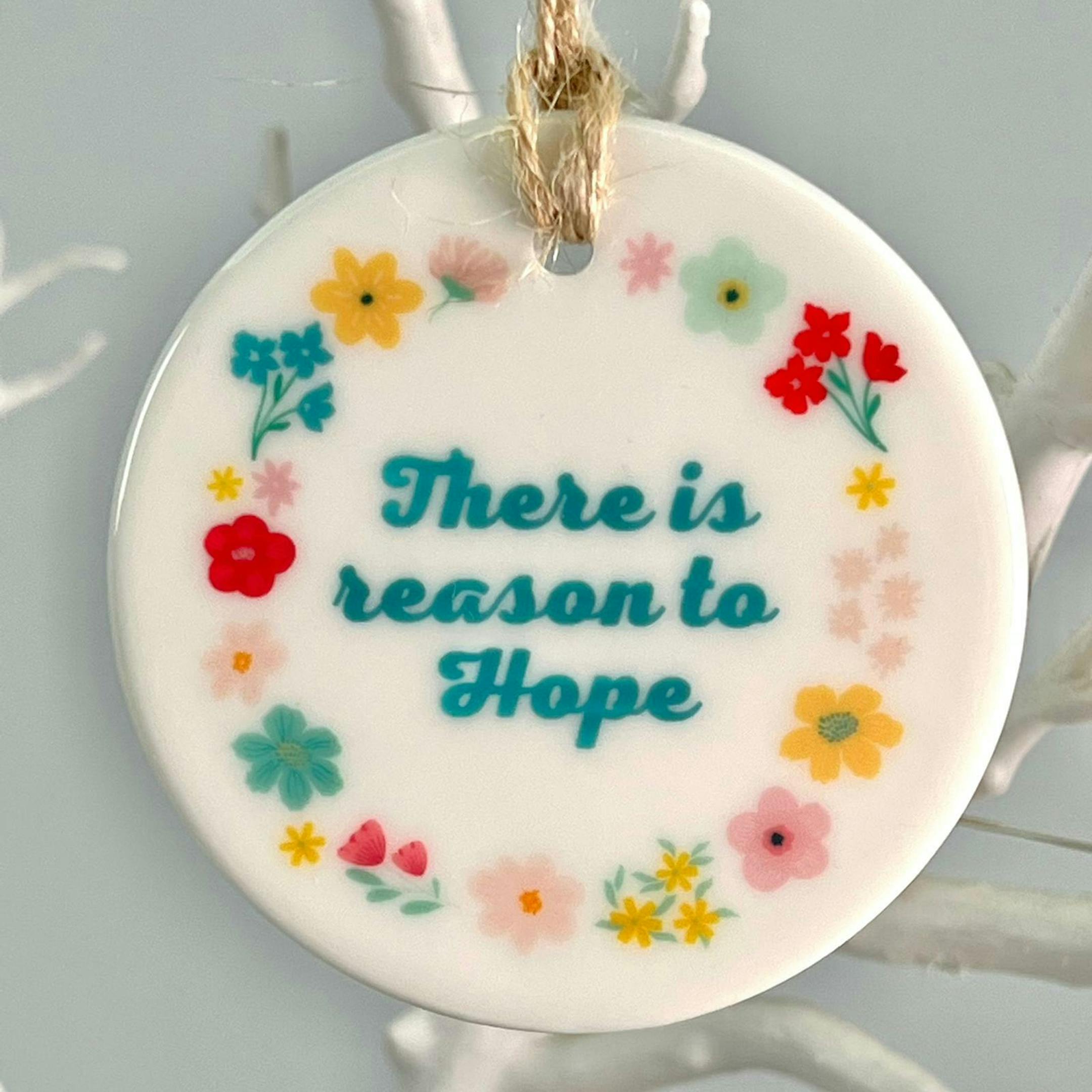 'There is reason to hope' set within a floral wreath. These decorations make a lovely gift of a new addition to your own Easter tree.