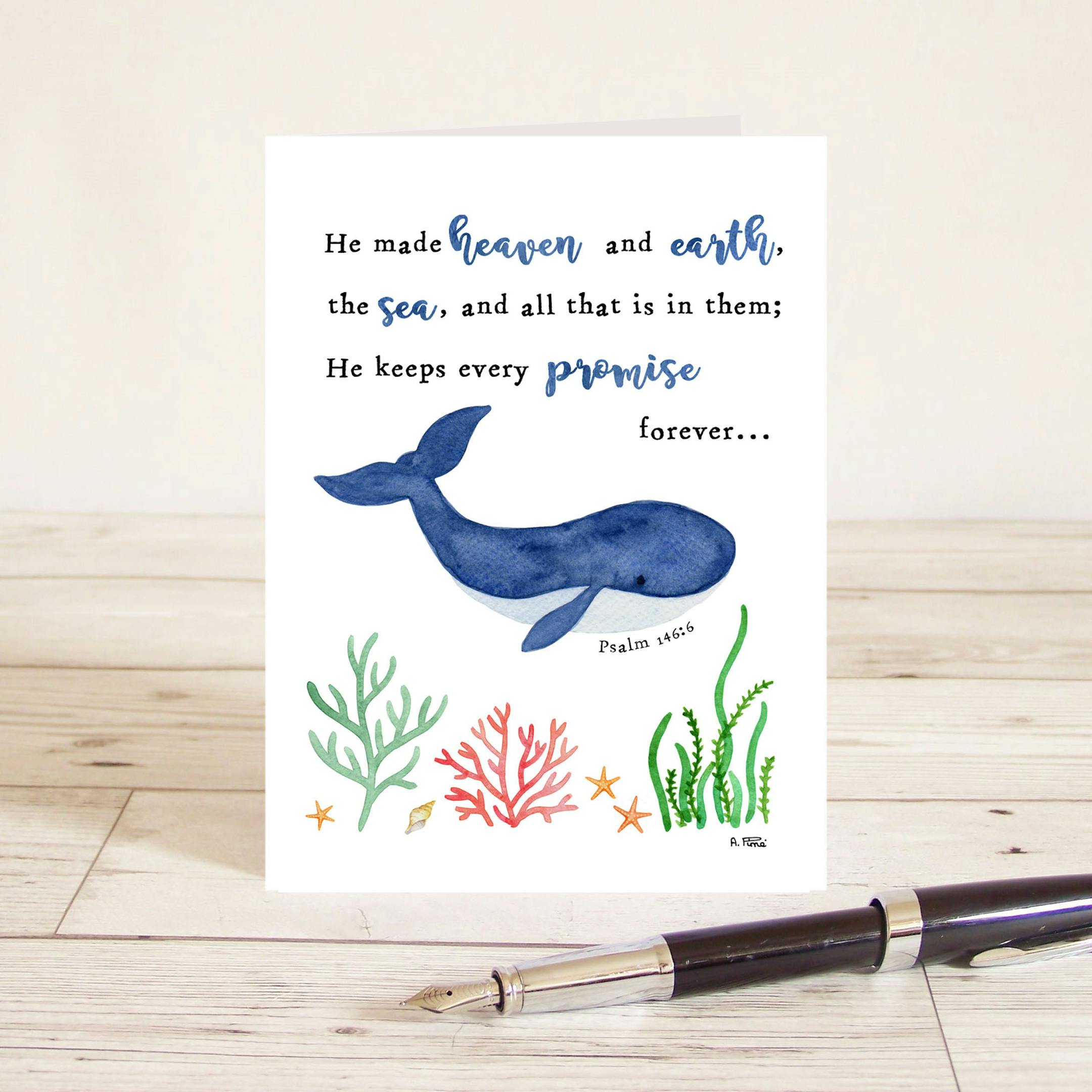 He made heaven and earth, the sea, and all that is in them... (Psalm 146:6) Greetings card with whale and seaside
