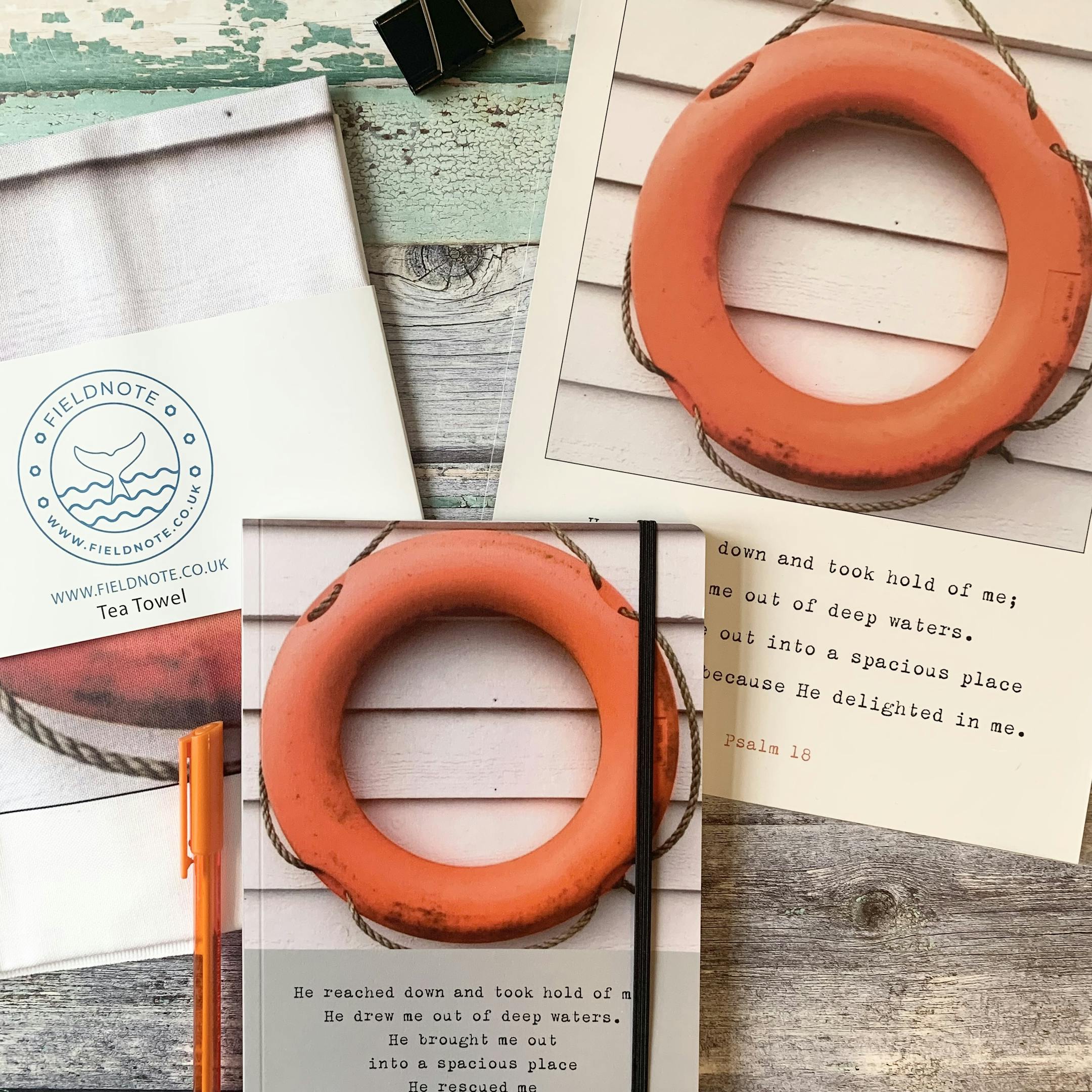 This box includes the He Rescued Me Tea Towel, matching A4 Print and A5 lined notebook, plus minty chocolates, all done up in blue.