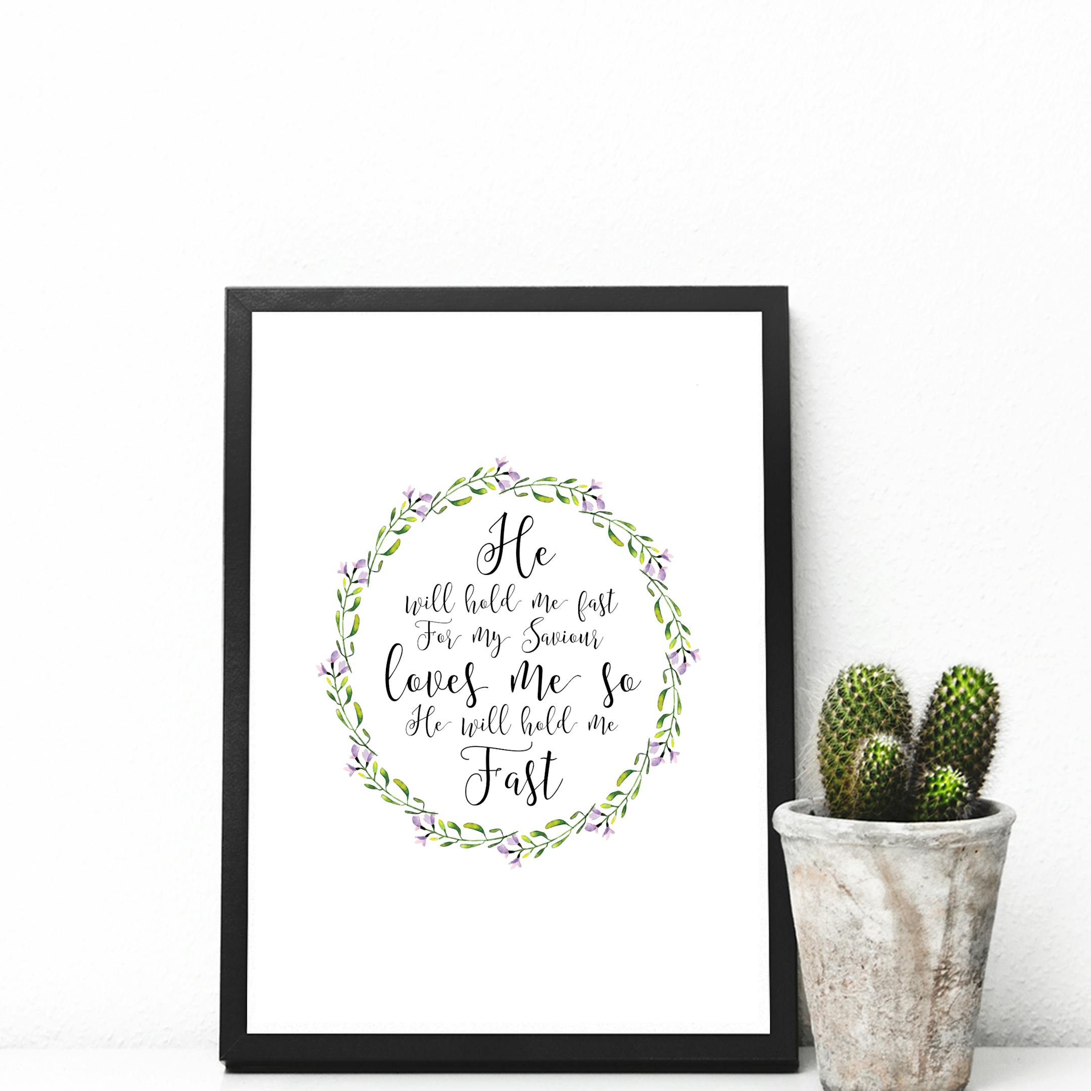 This beautiful A4 print features the encouraging words from the popular hymn: "He will hold me fast. For my Saviour loves me so, he will hold me fast". A lovely modern print featuring a delicate watercolour floral wreath and stunning typography.