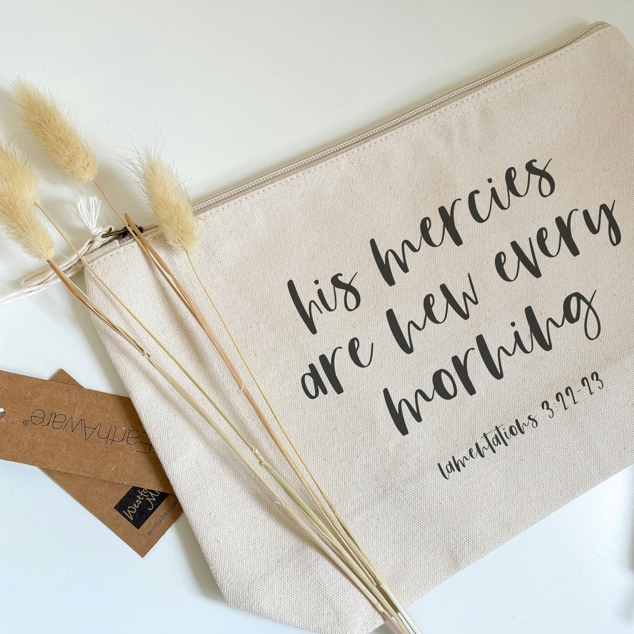 Zip pouch pencil case or cosmetic bag with "His Mercies Are New Every Morning" , perfect for keeping all your bible journaling bits and bobs all in one place.