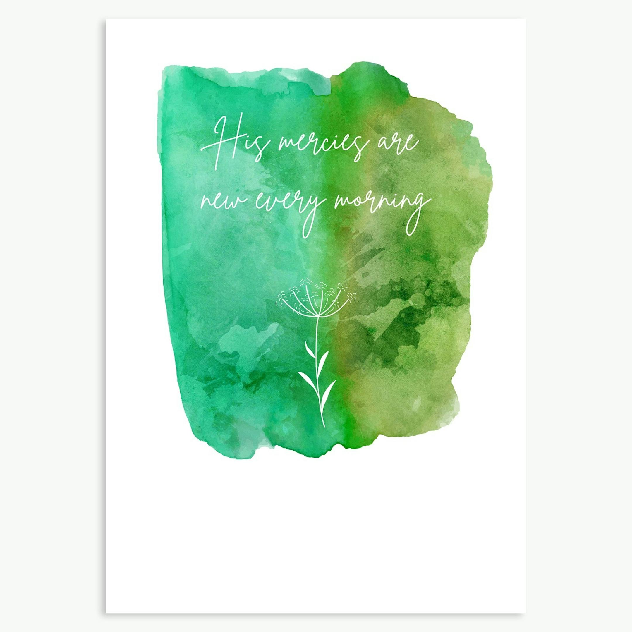 'His mercies are new every morning' set within a watercolour brushstroke with a wild flower beneath.
