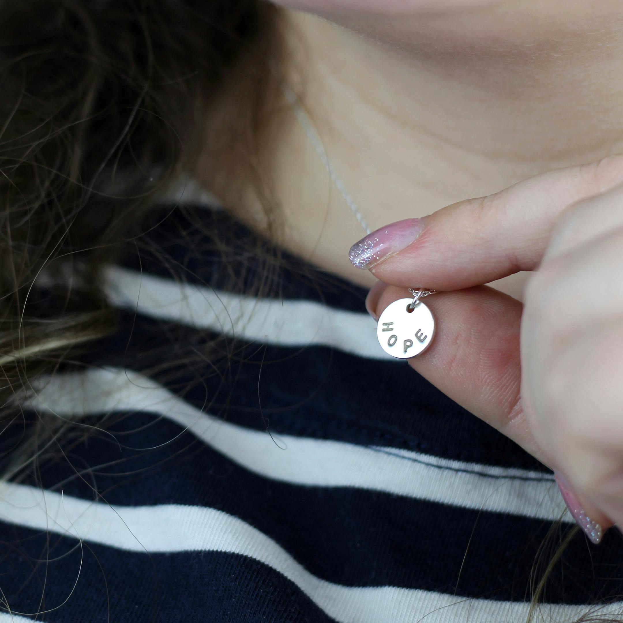Hand-stamped with the letters HOPE, this silver charm pendant is subtle and dainty. It would make a lovely encouraging gift for family or friends going through a tough time, or use it as a personal reminder to hope for better days ahead!