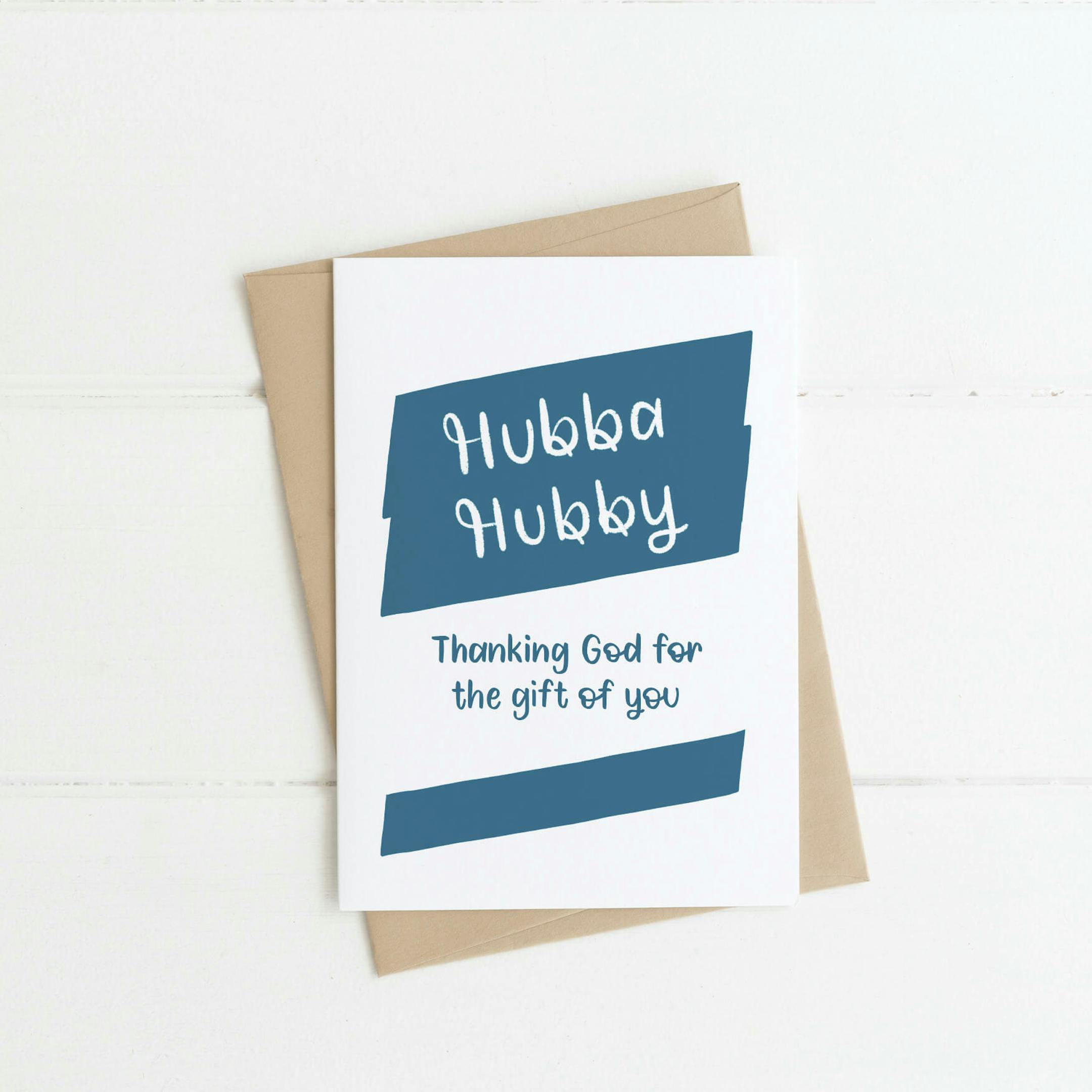 The design includes blue banners and white and blue hand lettered writing that reads “Hubba Hubby” with “Thanking God for the gift of you” underneath in my modern lettering style.