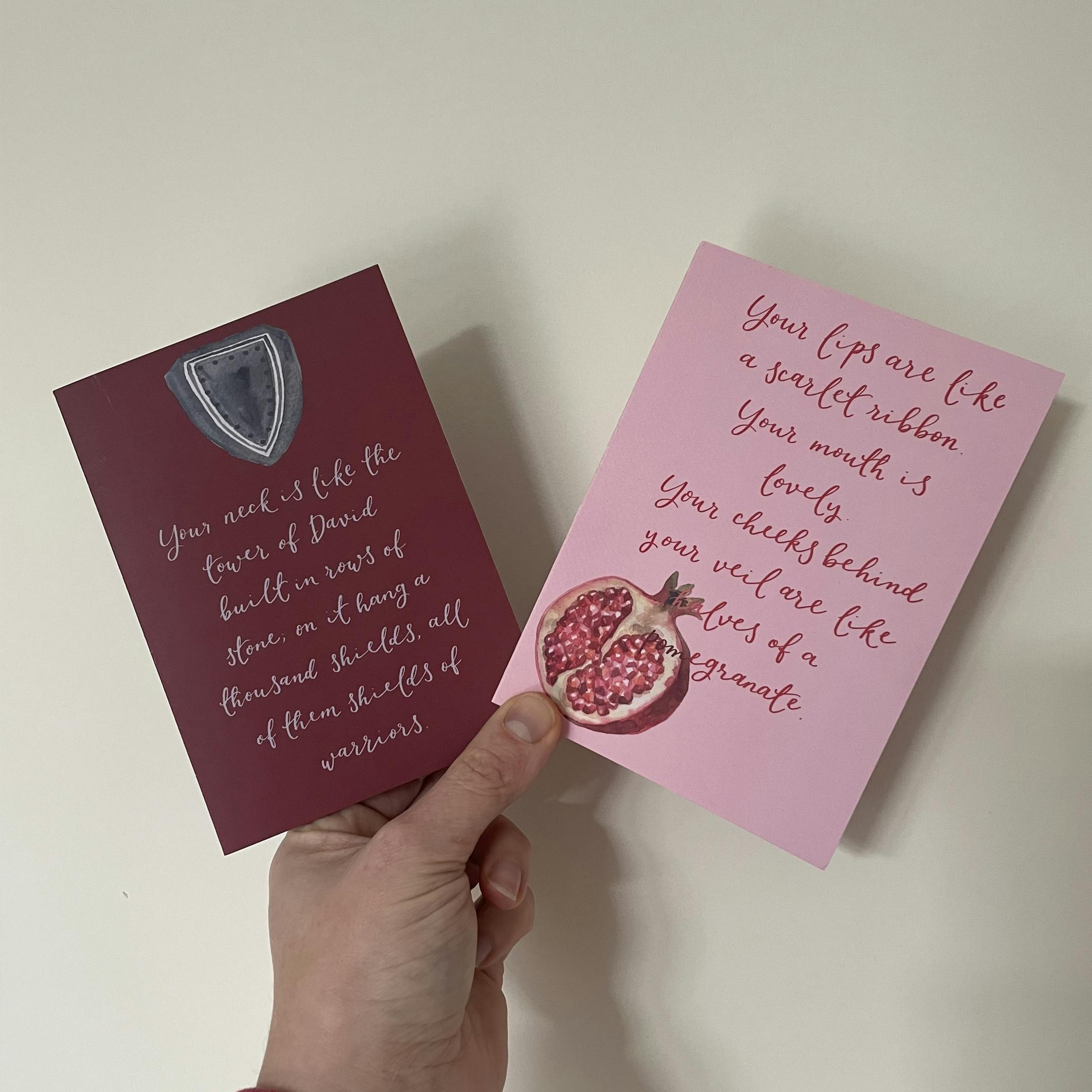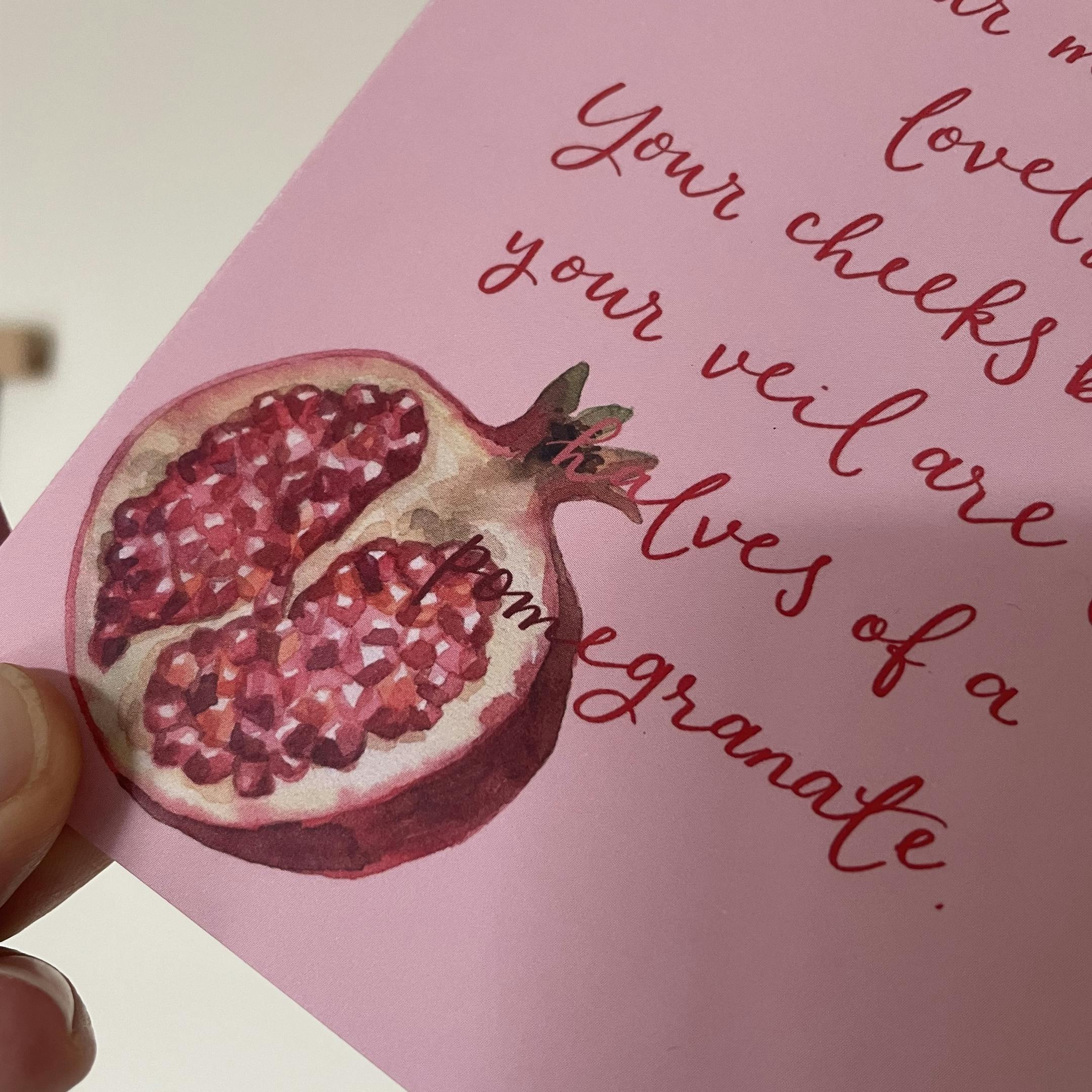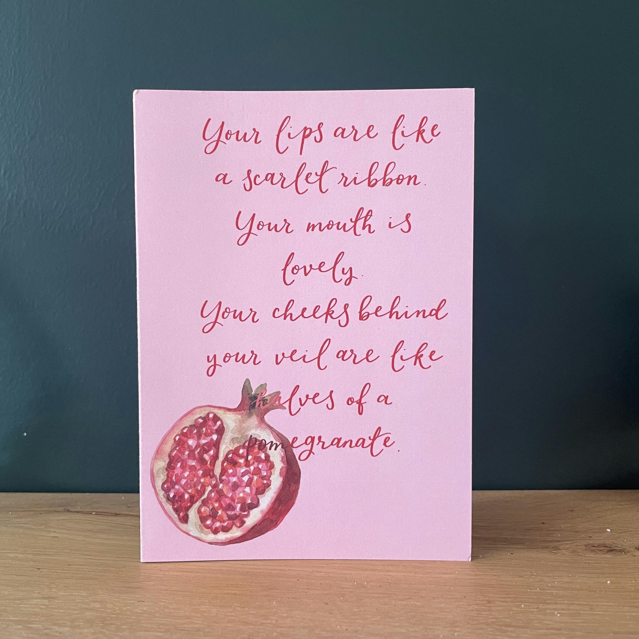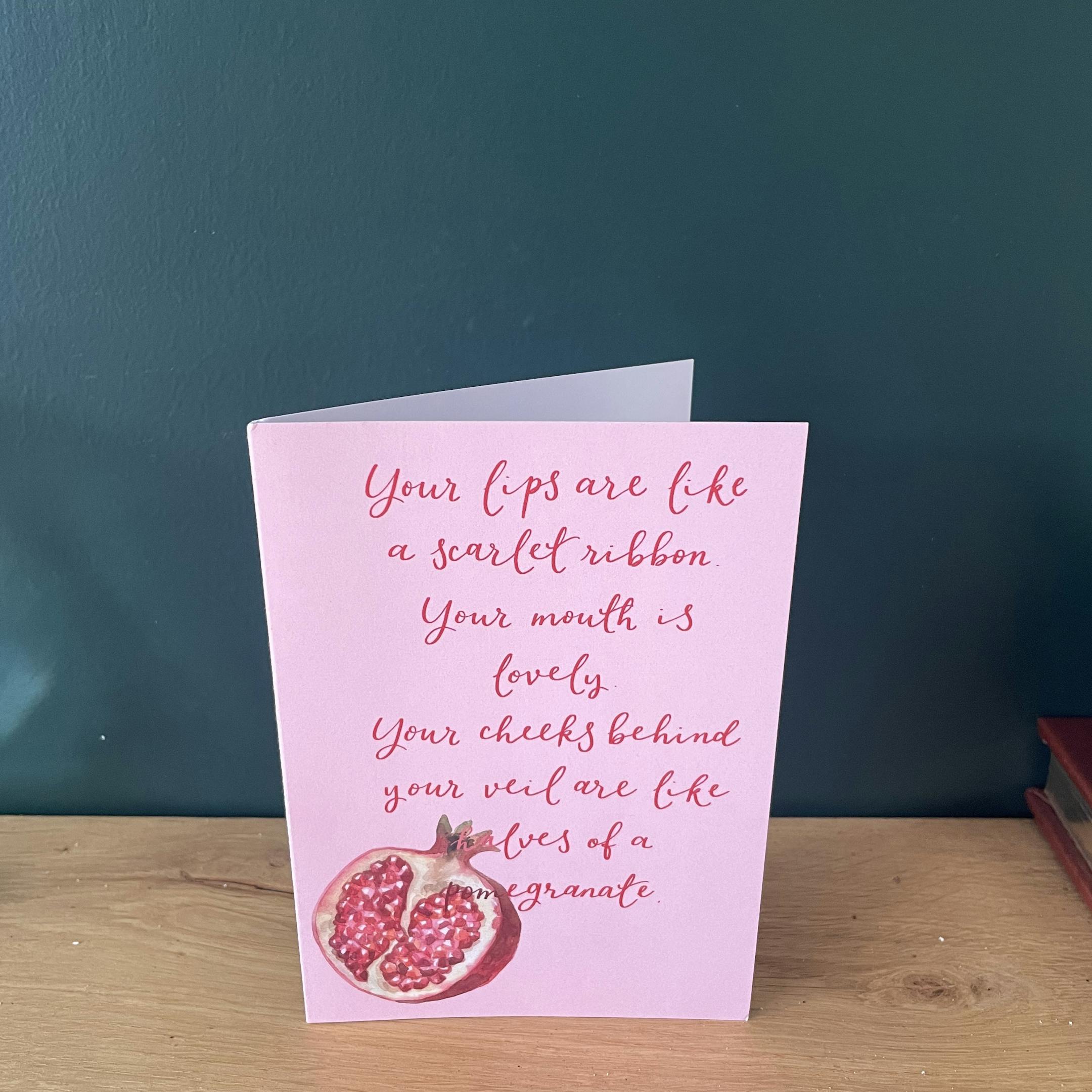 Hand lettered with words from Song of Songs, this funny and romantic Christian card says “your lips are like a scarlet ribbon. Your mouth is lovely. Your cheeks behind your veil are like halves of a pomegranate.”