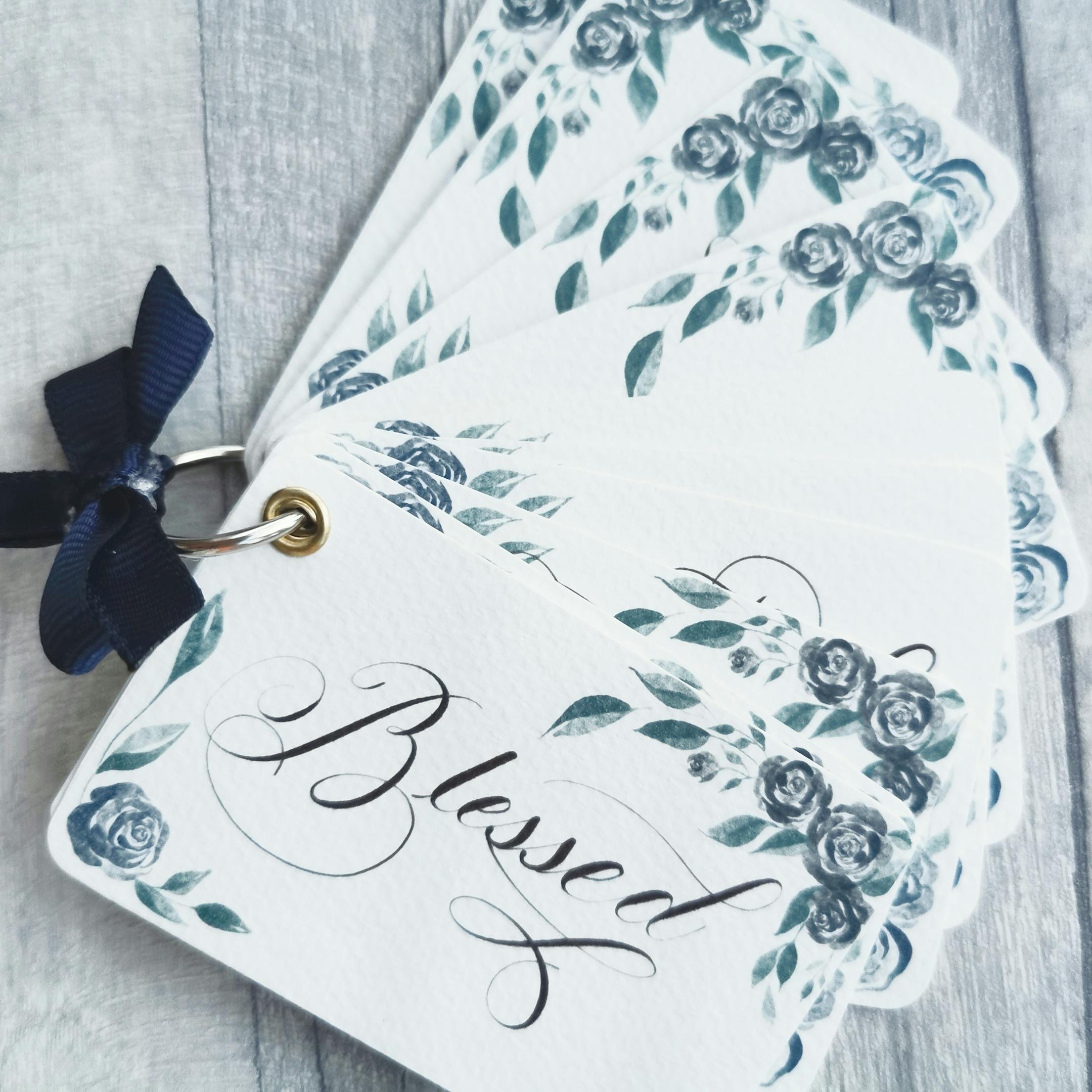 These beautiful floral scripture cards feature beautiful positive affirmations written in a flourished copperplate script with a corresponding bible scripture reminding you of who you are in Christ, surrounded with navy blue watercolour roses and rich green foliage.