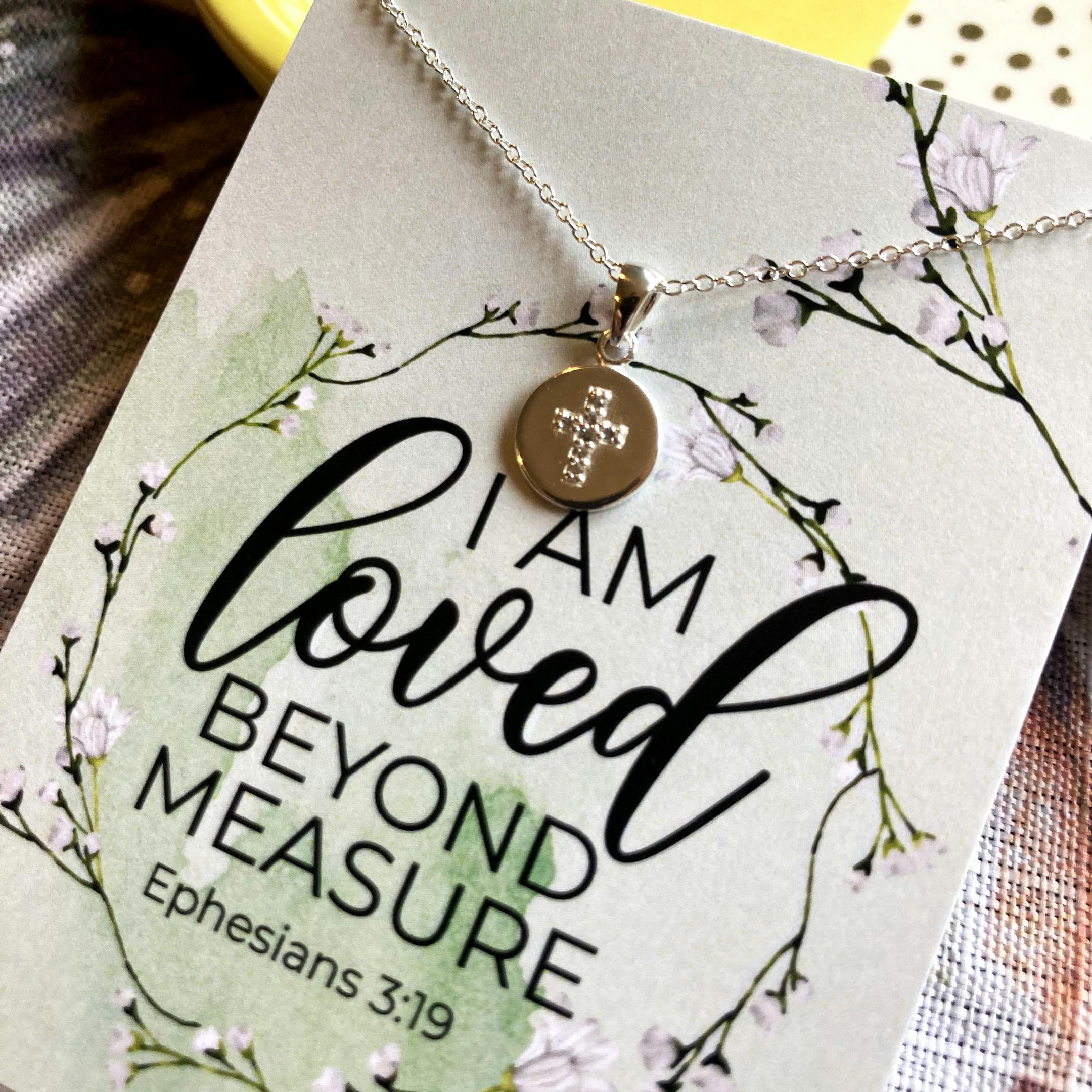 This pretty sterling silver cross pendant and necklace (stamped 925) comes on a beautifully designed card featuring the verse 'I am loved beyond measure’ - Ephesians 3:19