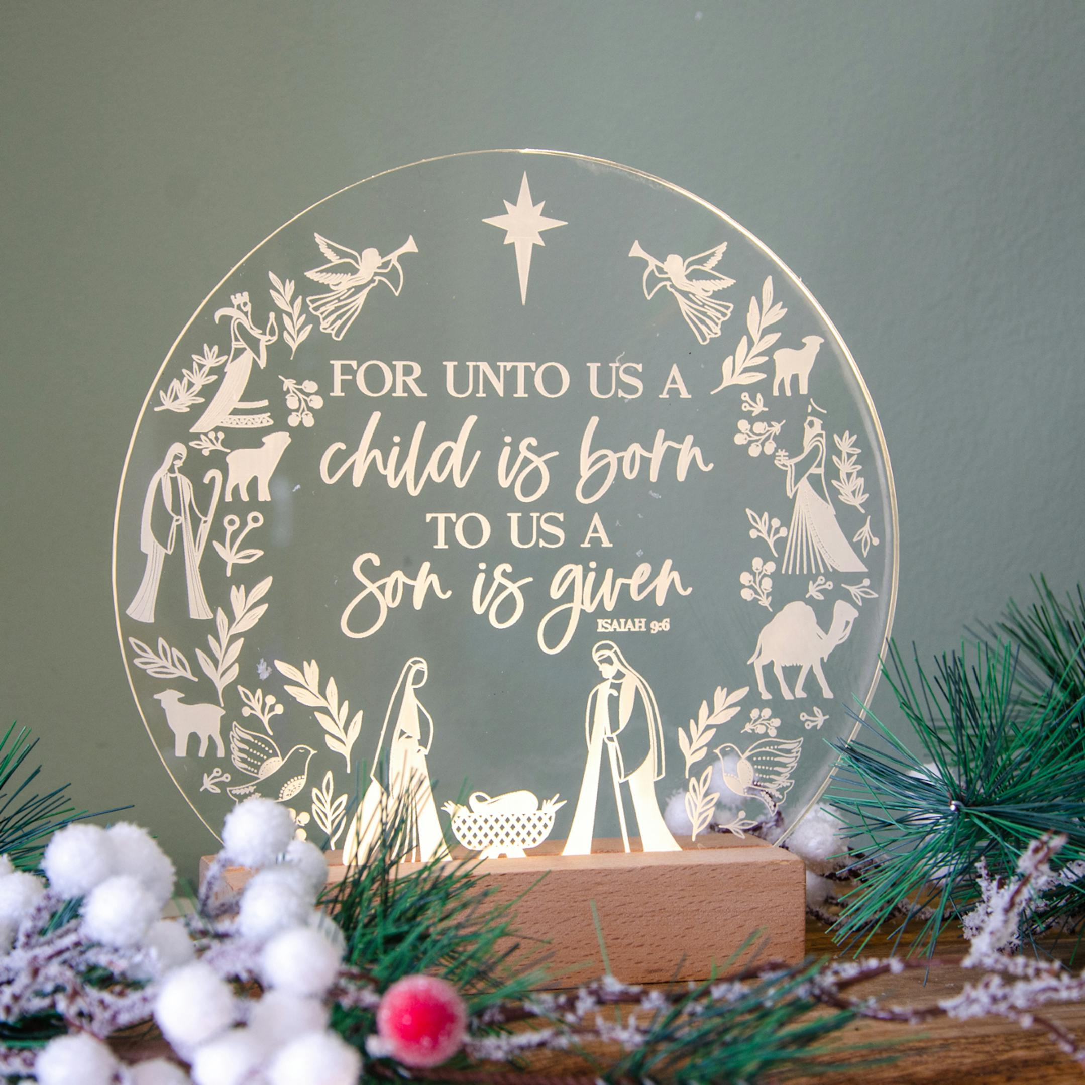 Celebrate the story of Christmas with our Unto us a child is born Isaiah 9:6 uniquely illustrated christmas story light. Engraved on 5mm perspex, which you simply slot into the LED light base to create your unique and festive light.