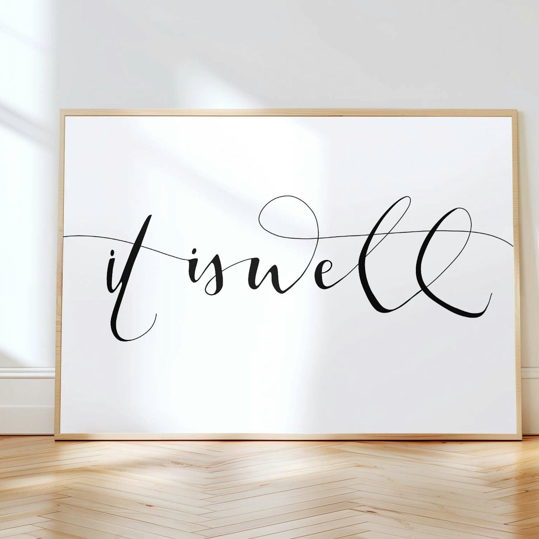 This beautiful and inspiring wall print features the uplifting words from the well known song, ‘it is well with my soul', in hand-lettered, modern calligraphy in black in.