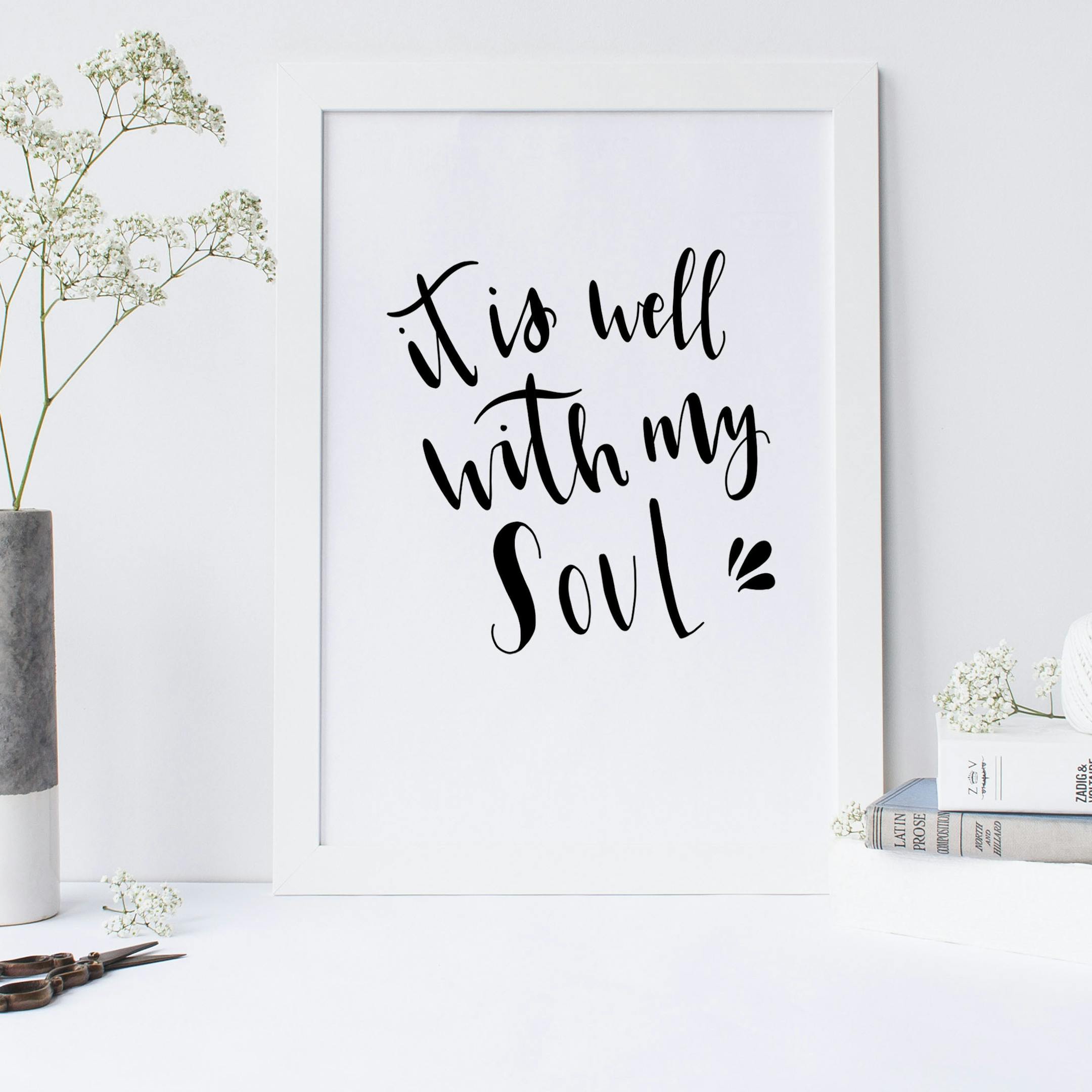 This beautiful and inspiring wall print features the uplifting words from the well known song, ‘it is well with my soul', in hand-lettered, modern calligraphy.