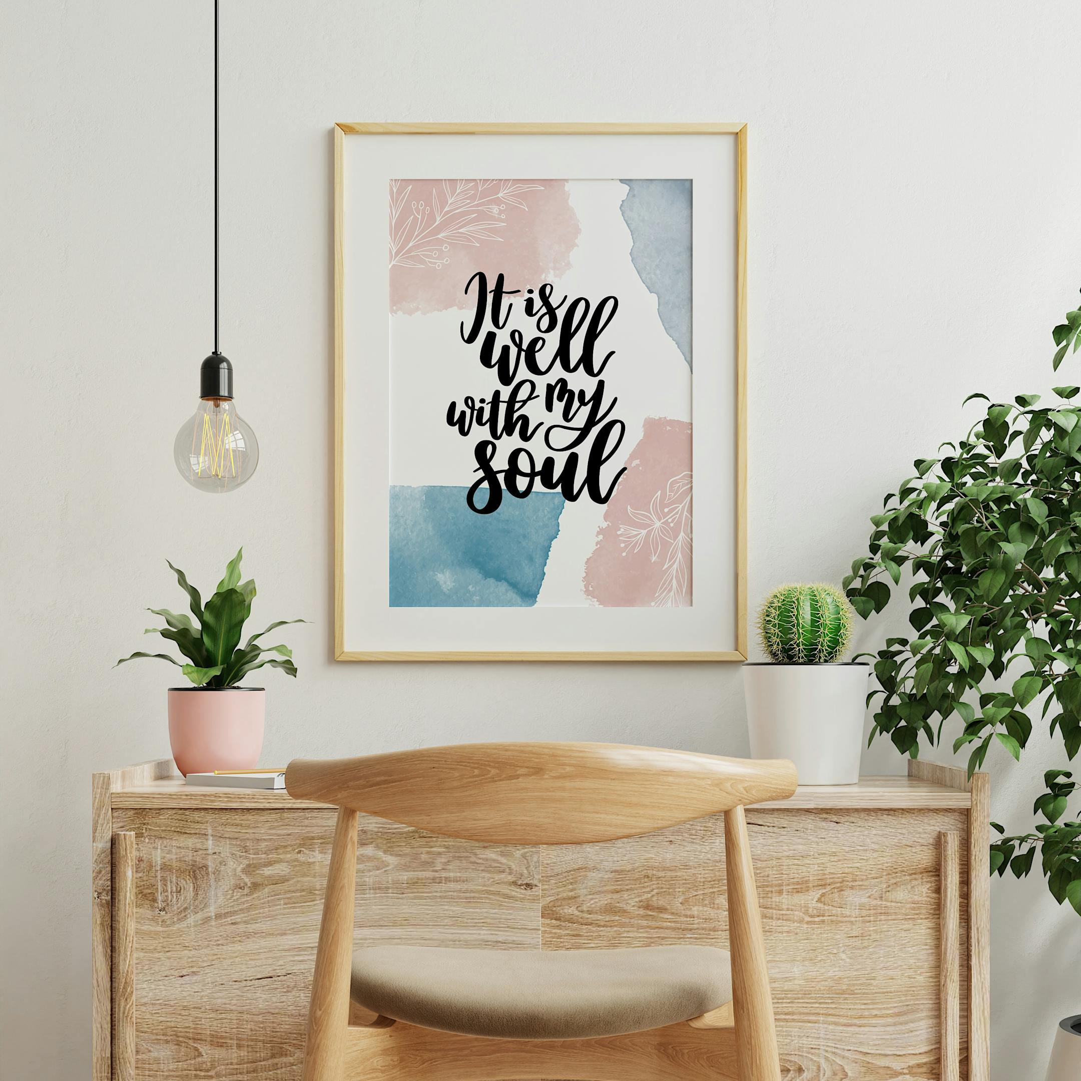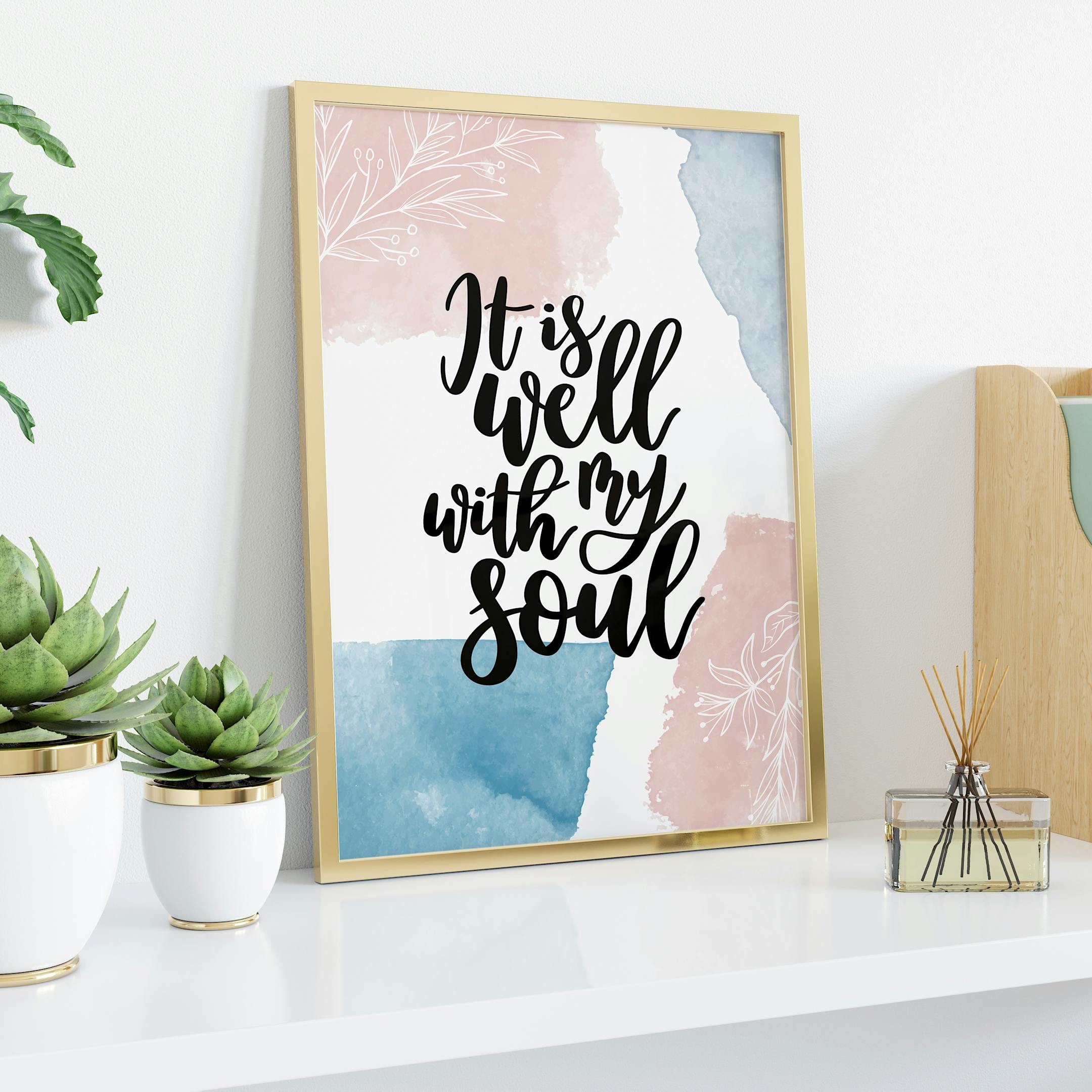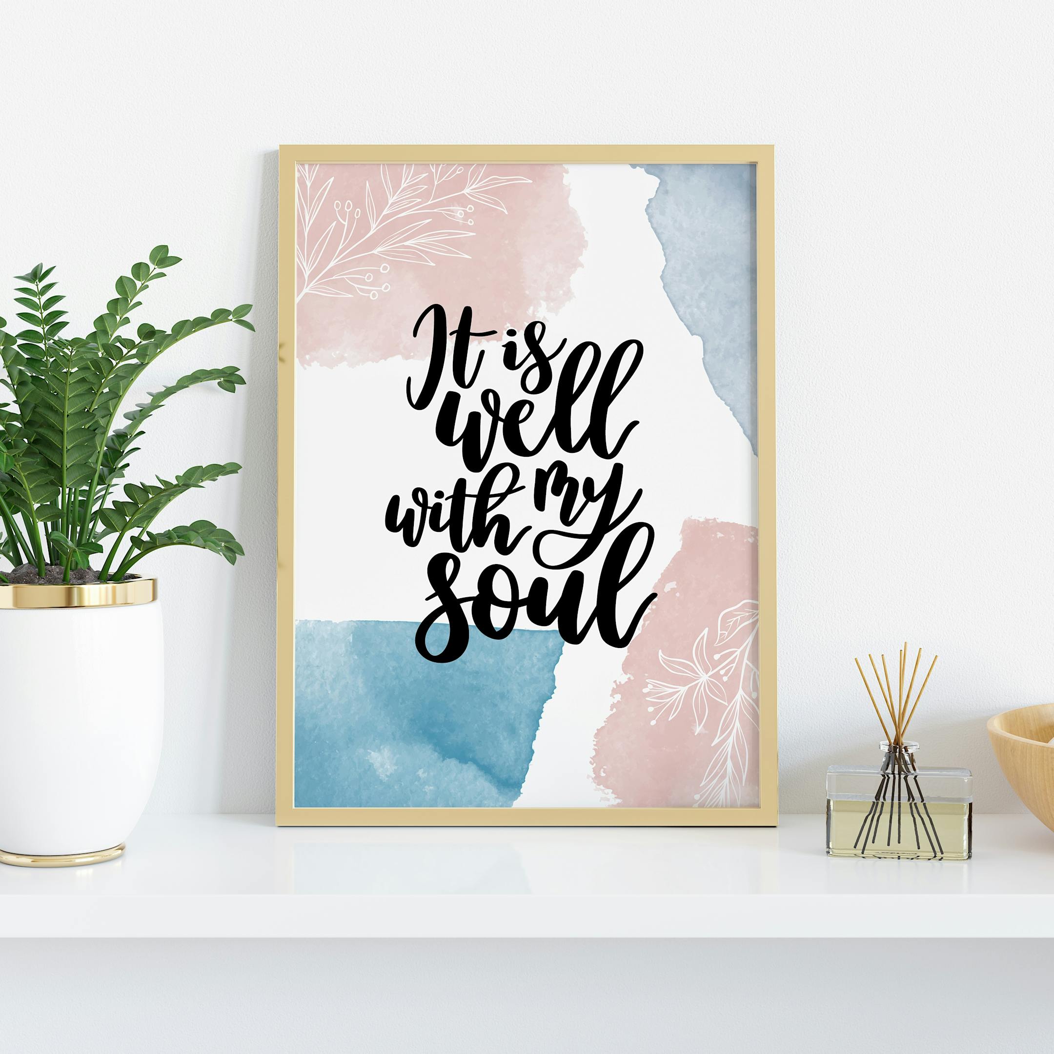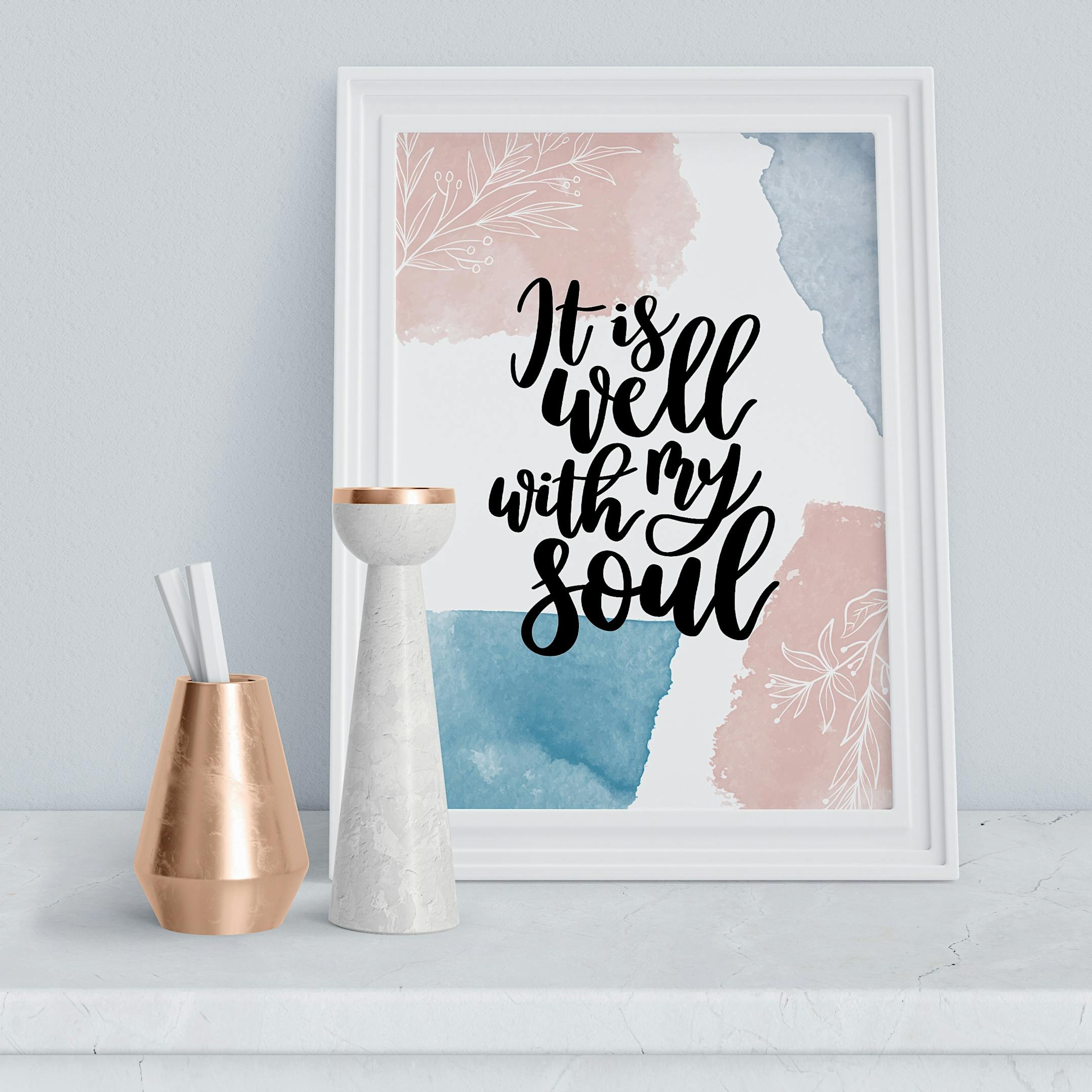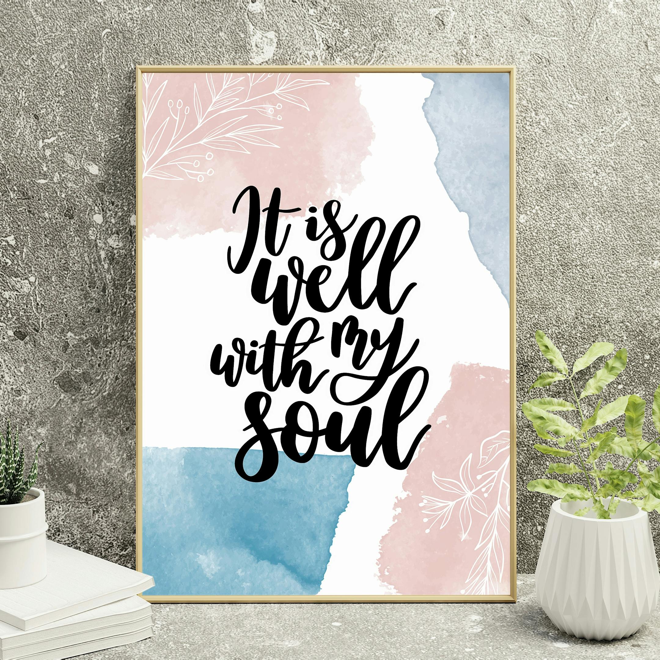 This inspirational print features bold, eye-catching hand-written calligraphy of the beautiful message, 'It is well with my soul'.