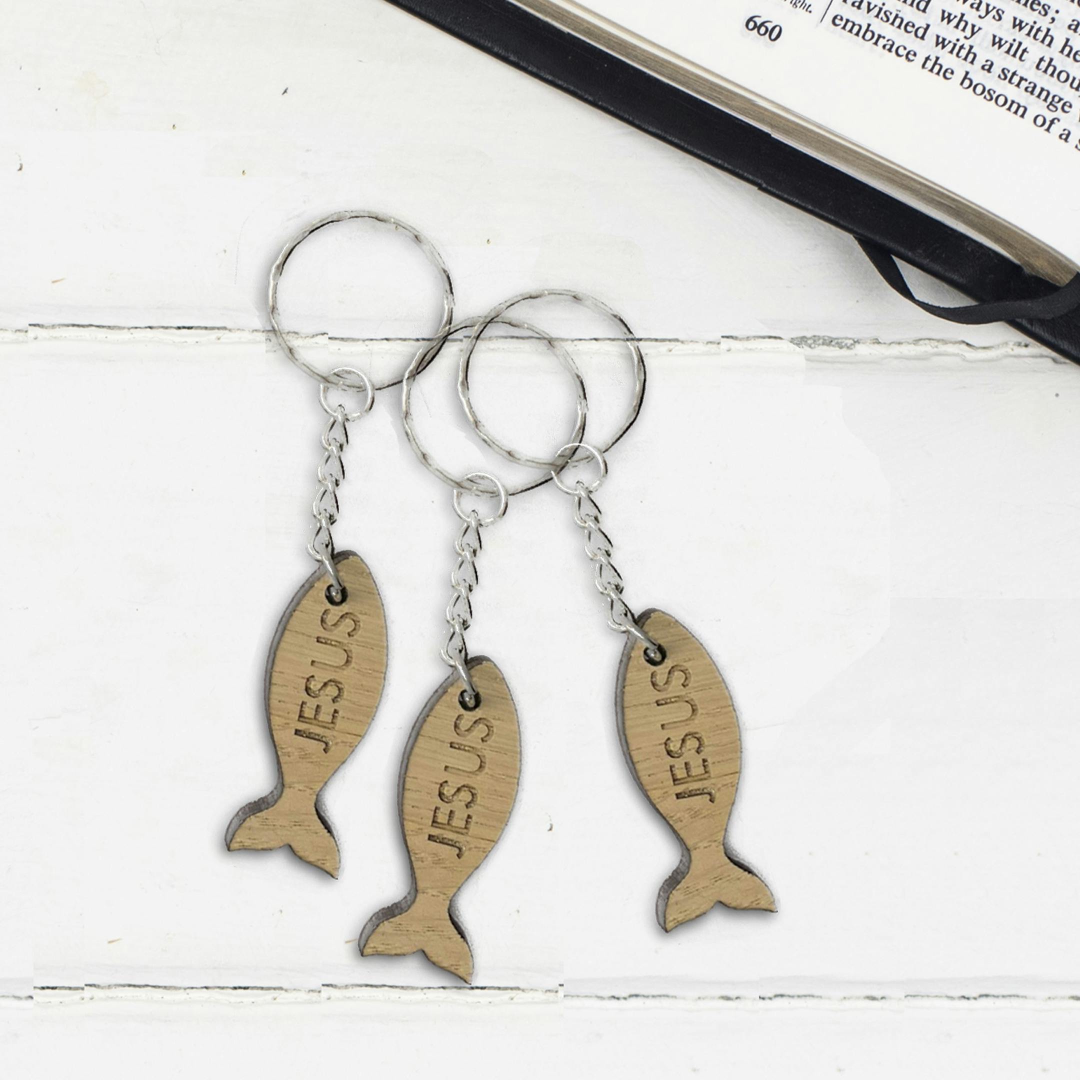 This lovely little oak veneered key ring measures 9cm in length from the top of the ring to the bottom of the fish tail, and has the name of Jesus engraved thereon.