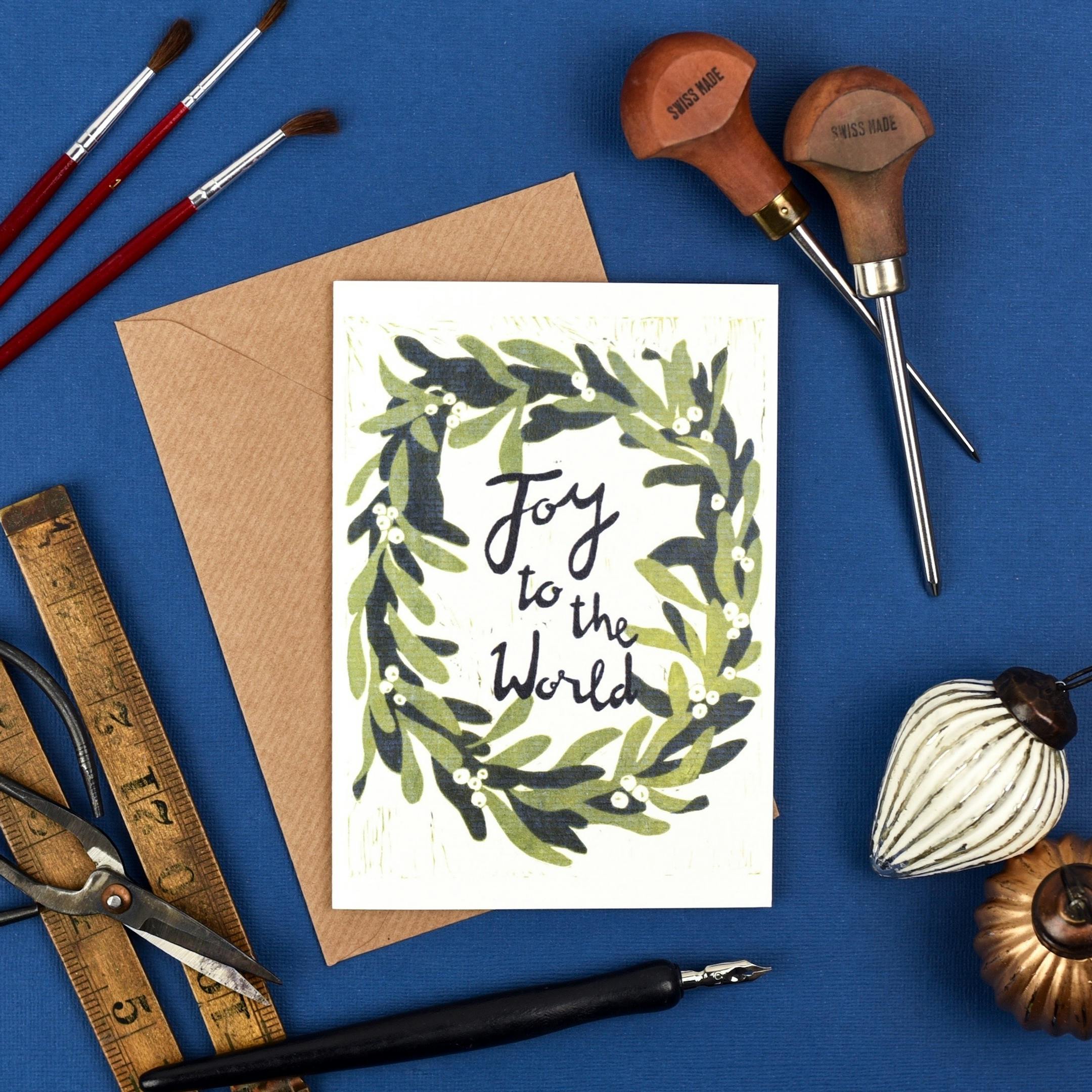 A6 textured greetings card reading 'Joy To The World' set within a festive mistletoe wreath.