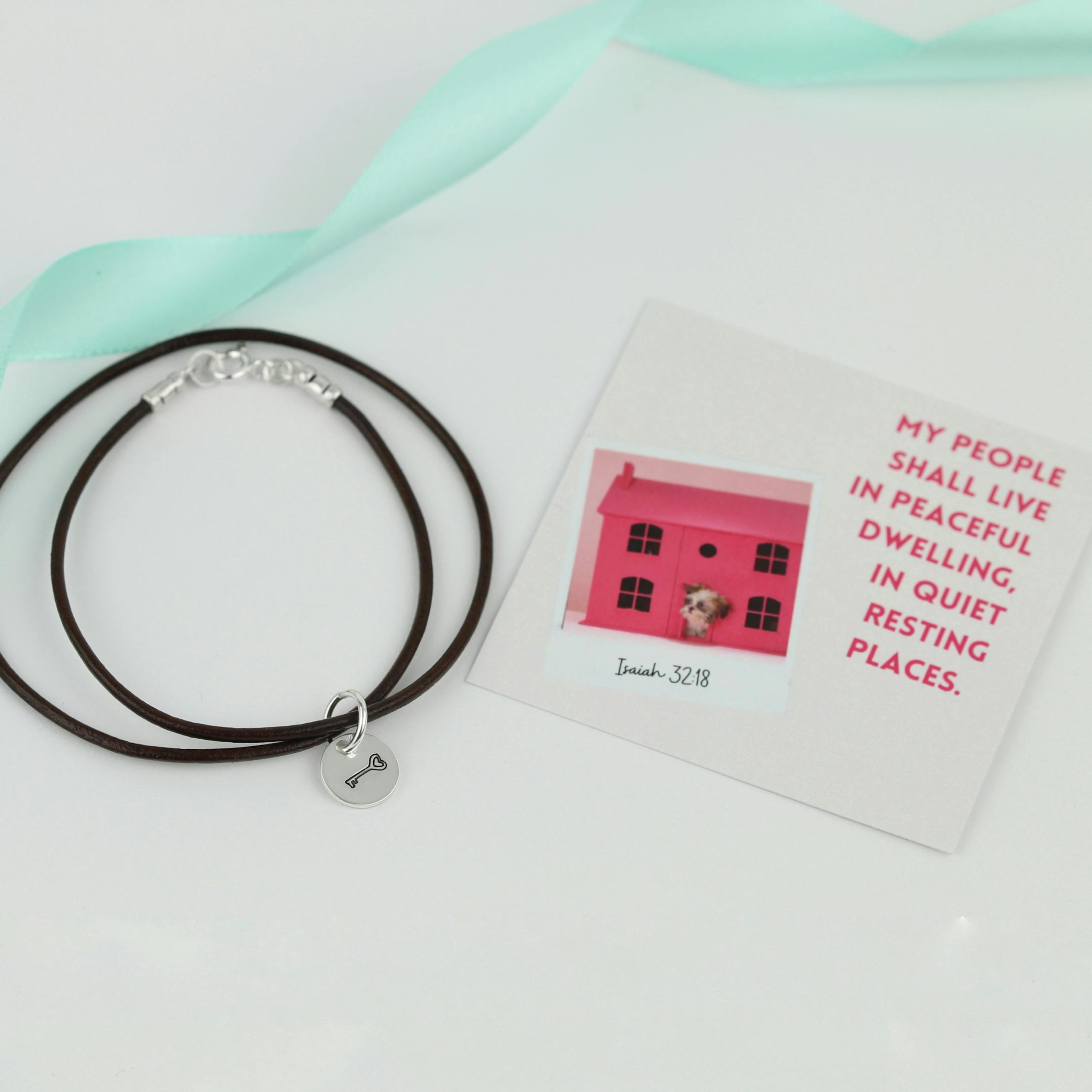 Simple and cute, this Leather Wrap Bracelet features a sterling silver key charm. The accompanying Bible verse is Isaiah 32:18. Perfect as a New Home gift!