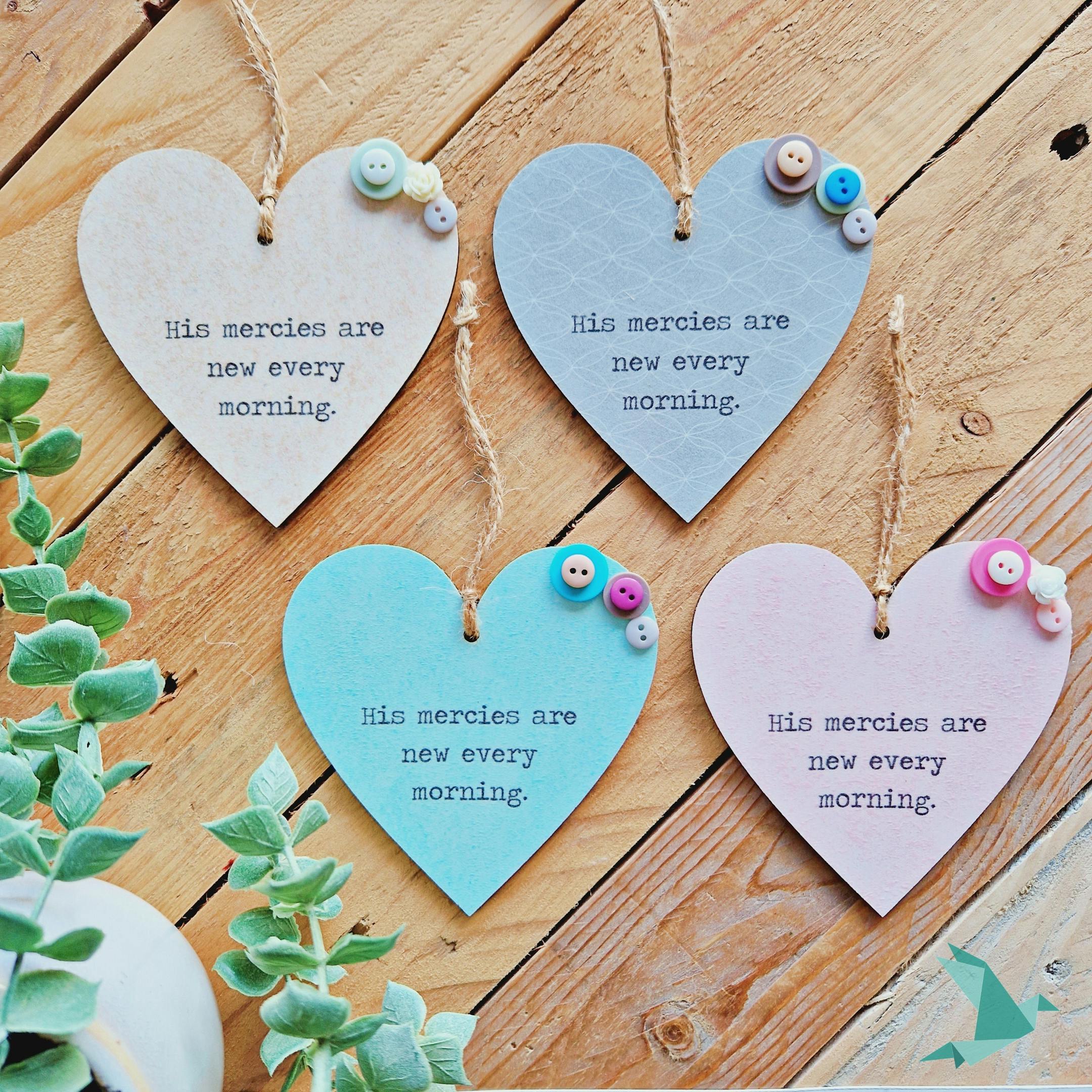 Individually handcrafted wooden hearts with printed scripture or inspirational and uplifting words.