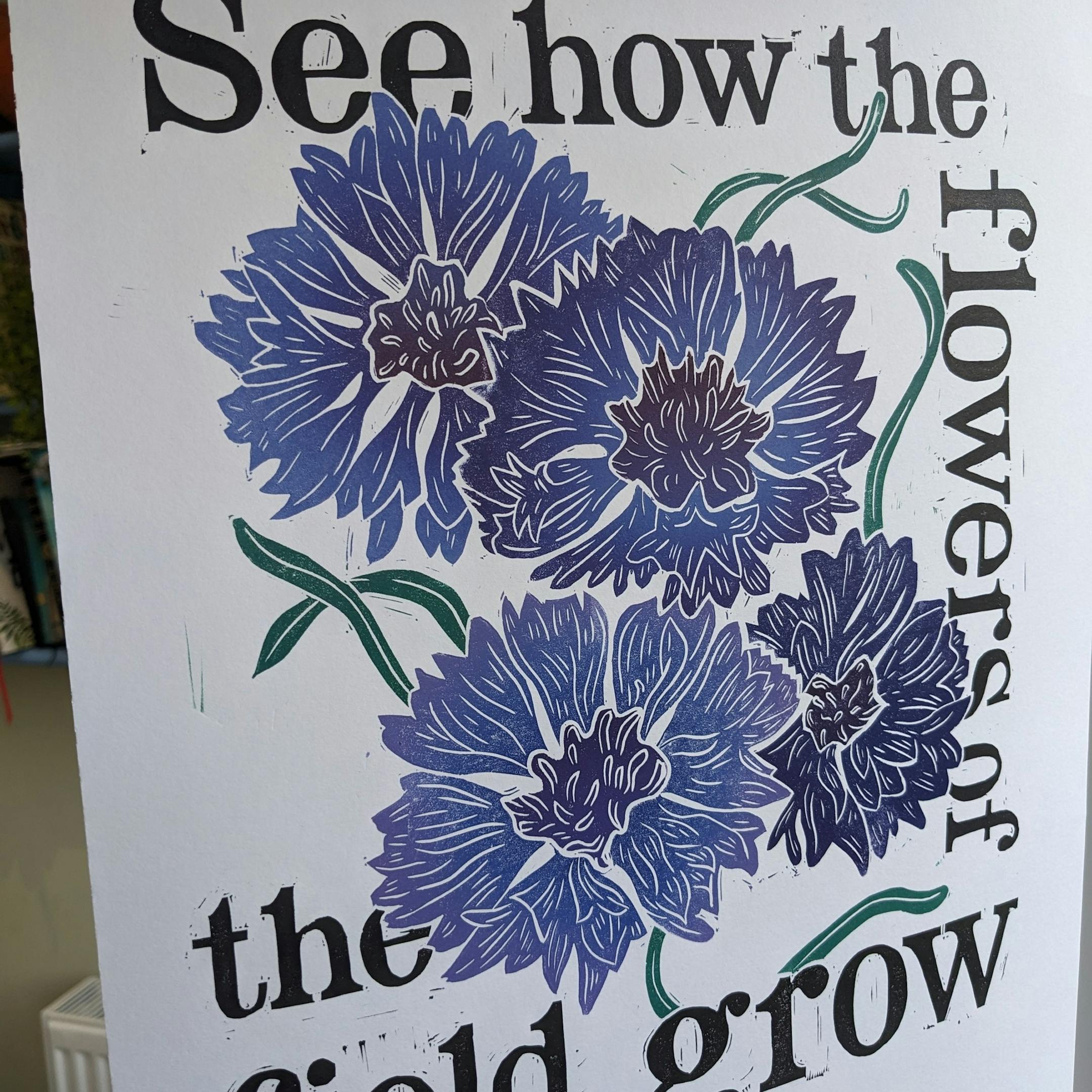 Linocut based of Matthew 6v28. Cornflowers and text.