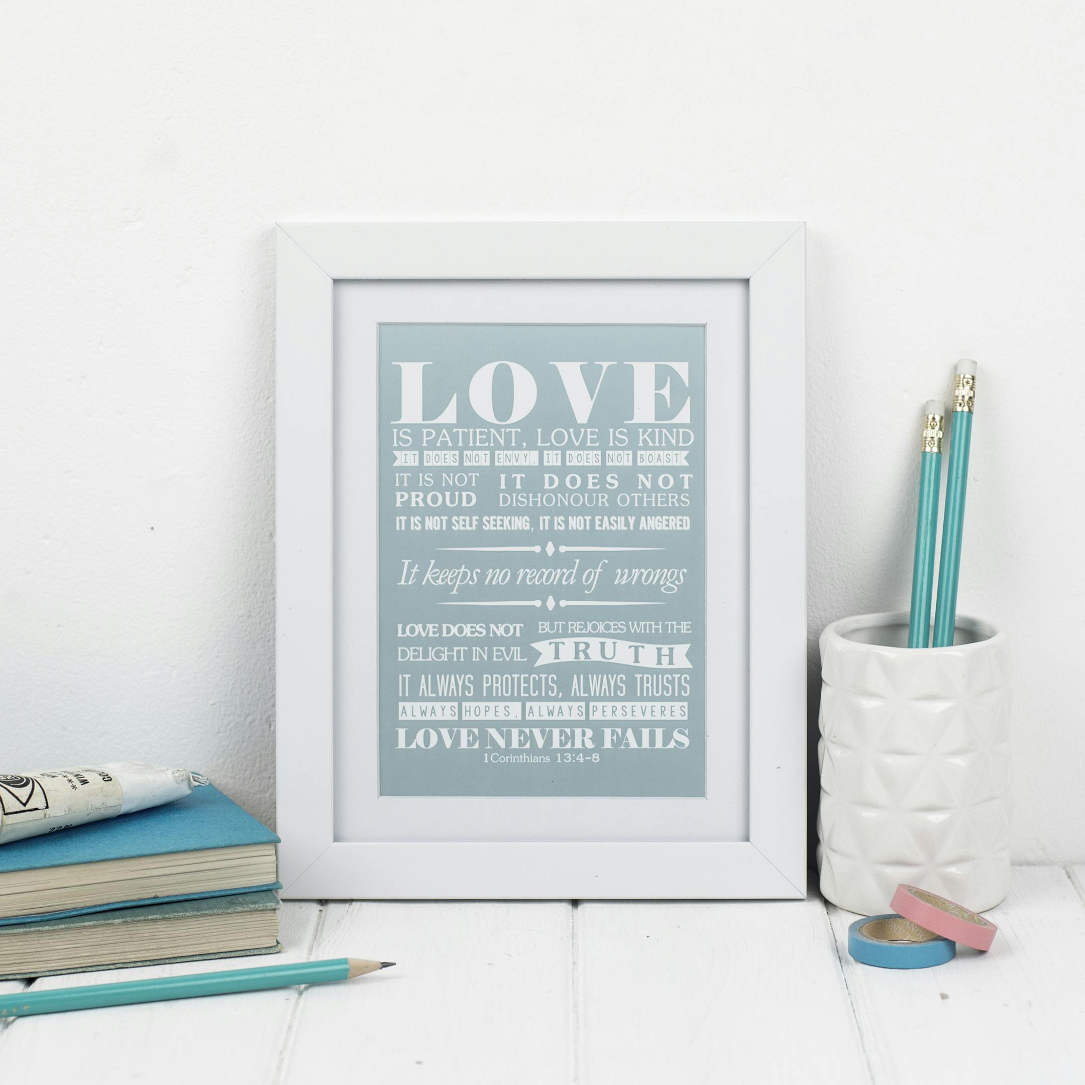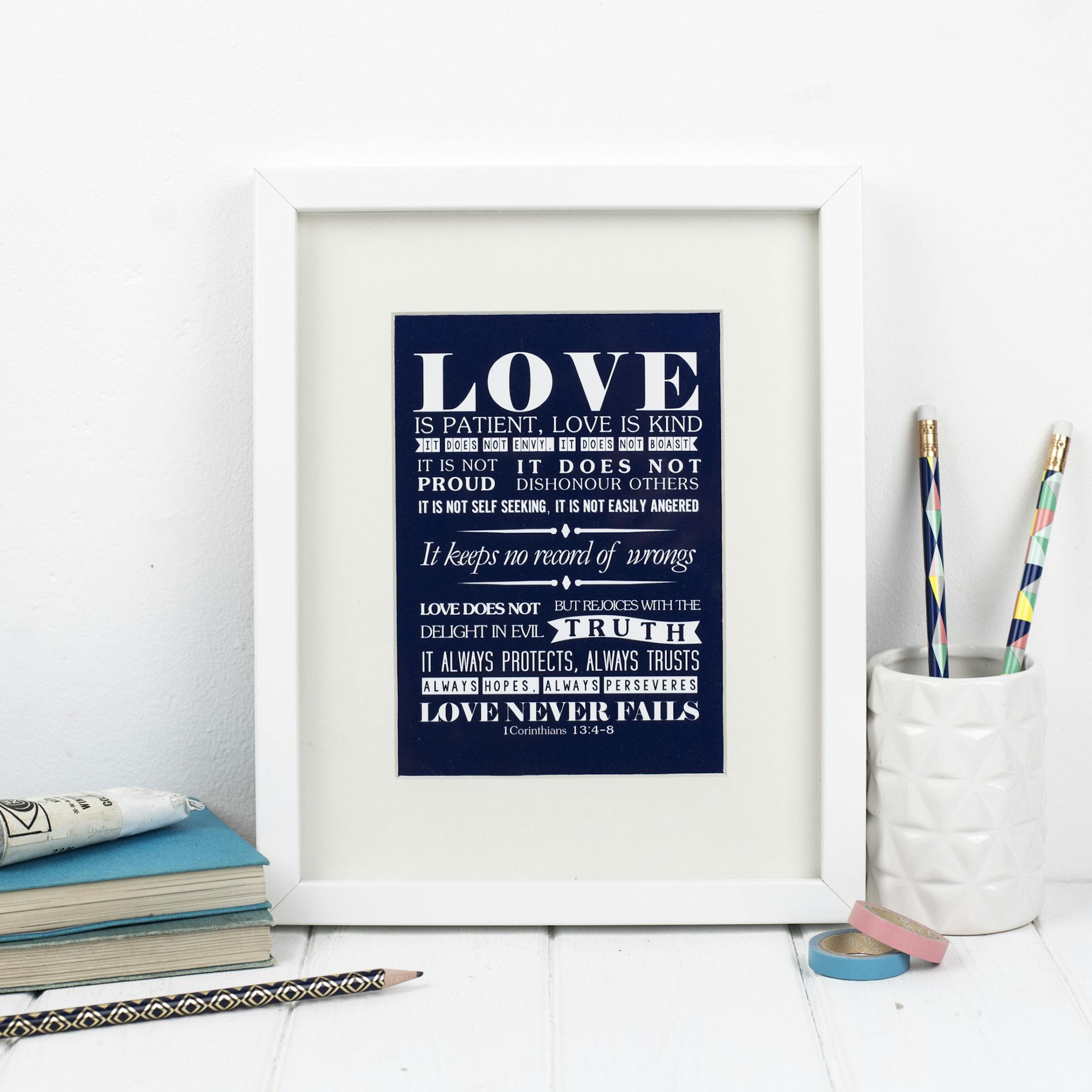 A beautifully handmade made bible verse print of 1 Corinthians 13:4-8. This item is fully mounted and framed – makes a perfect gift. Can be hung on the wall or propped on a table.