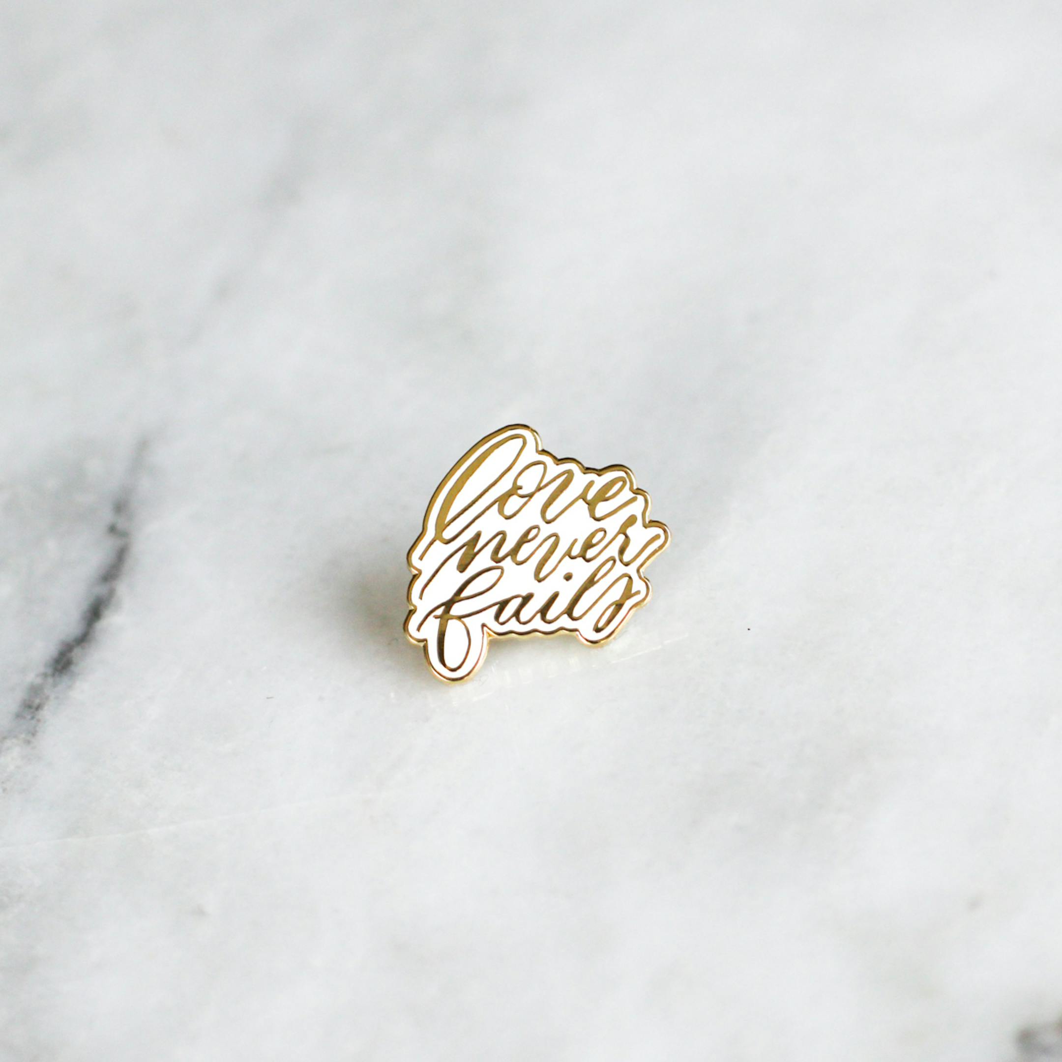A soft gold plated and white enamel pin featuring the hand lettered phrase, love never fails.