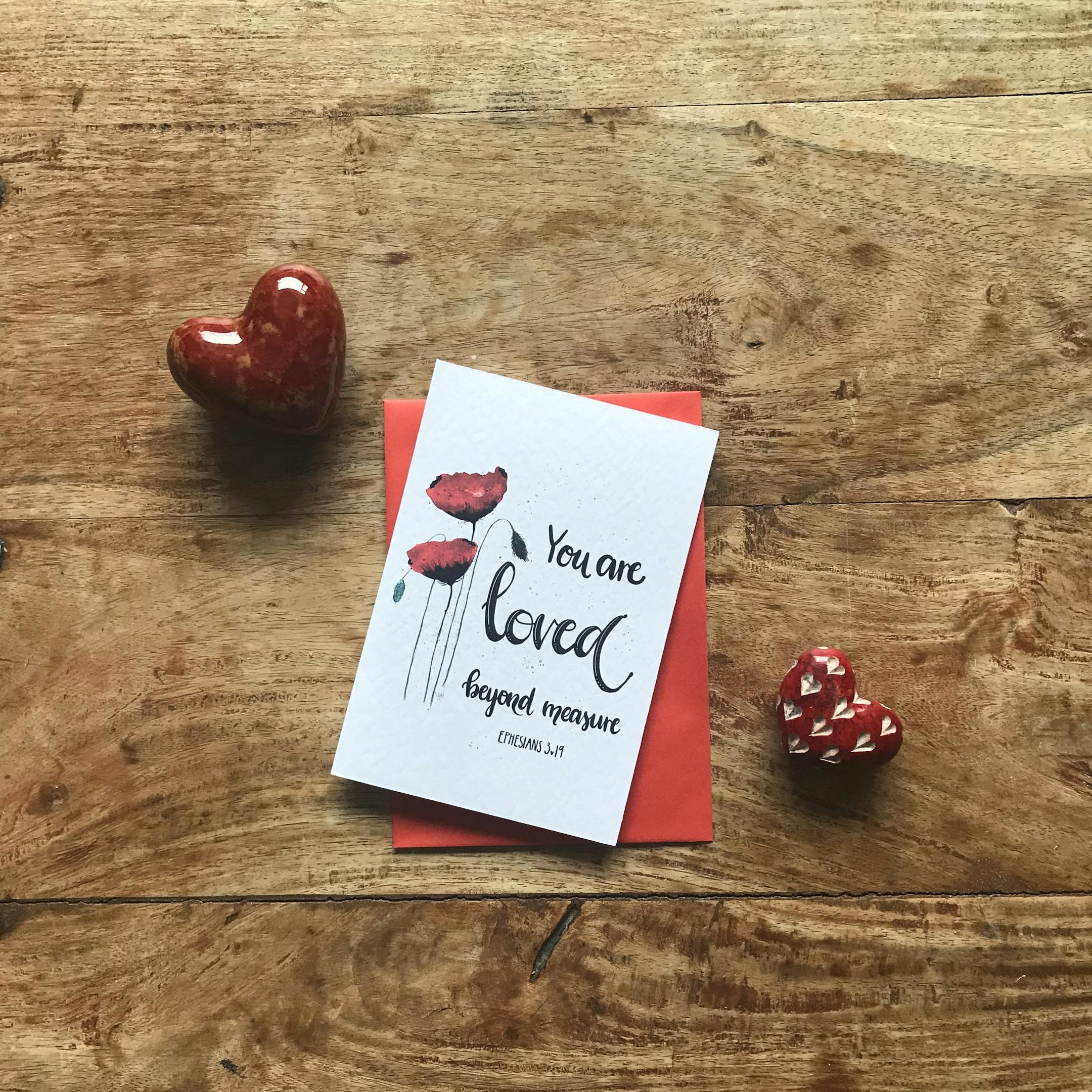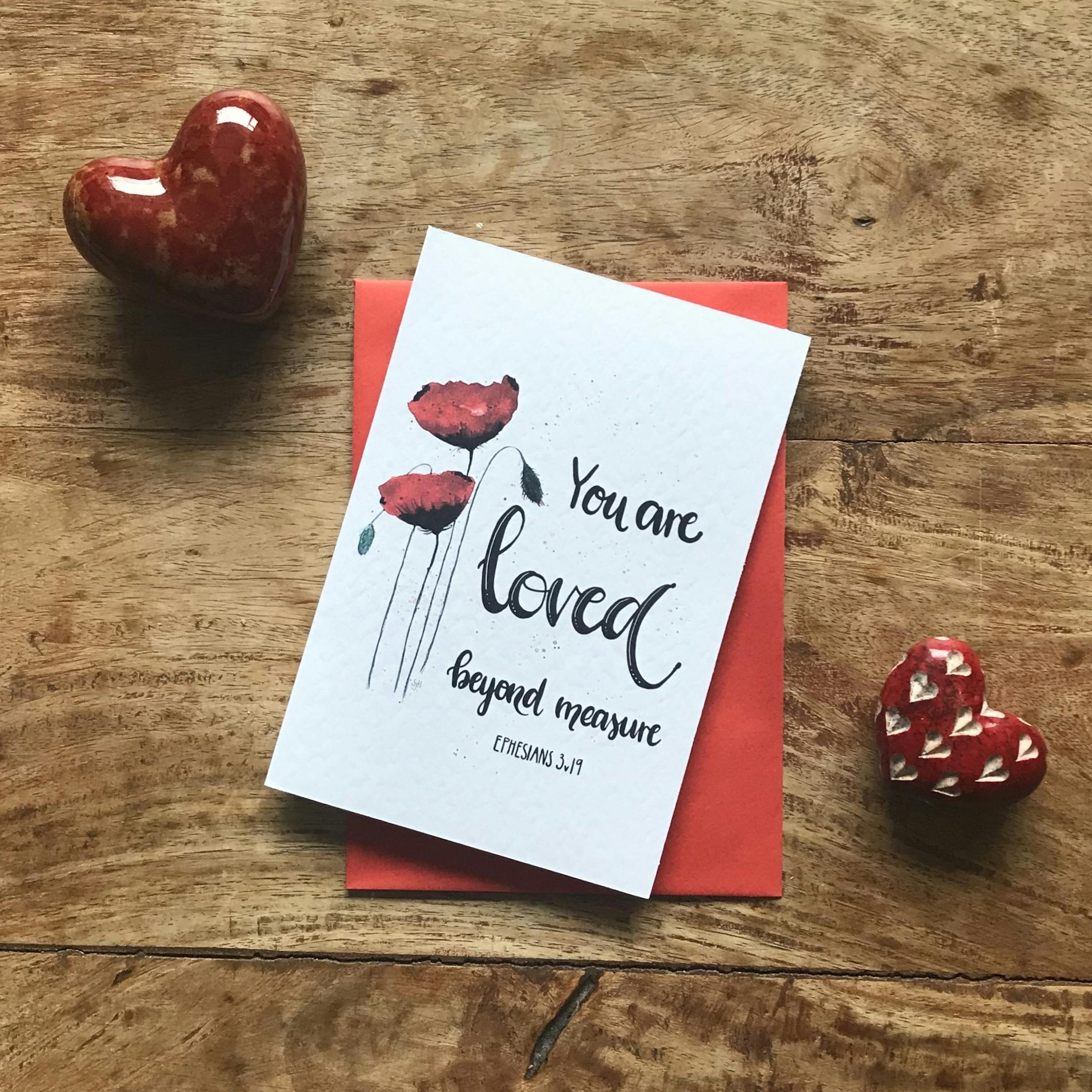 You are loved beyond measure. This lovely hand lettered greetings card features beautiful watercolour poppies and the promise from Ephesians 3:19.