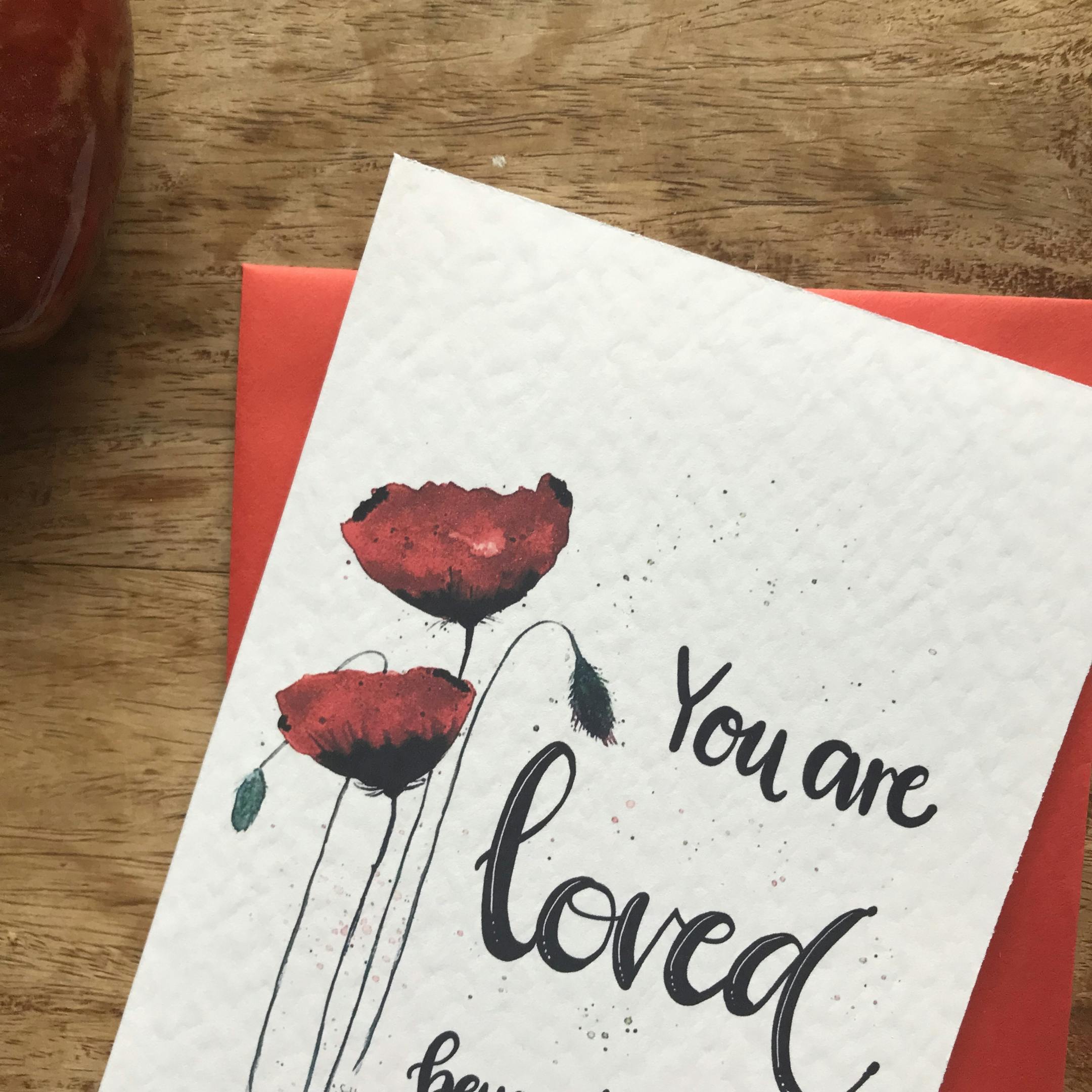 You are loved beyond measure, Ephesians 3:19. Hand lettered greetings card with watercolour poppies.