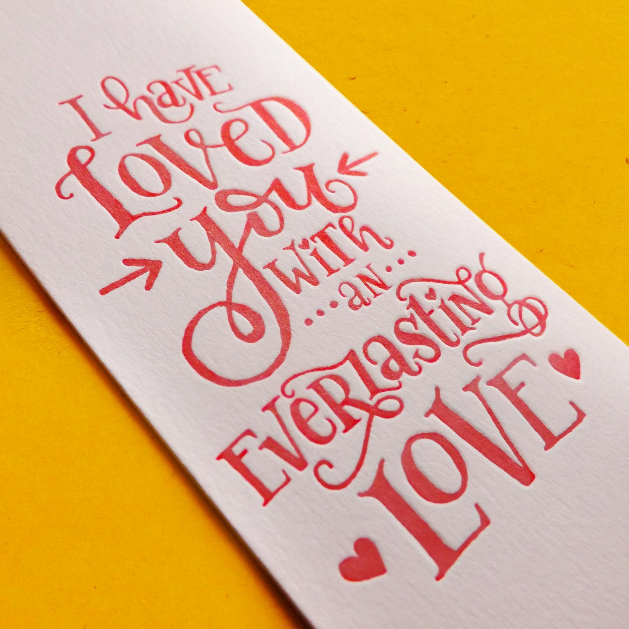A beautiful reassuring letterpress bookmark featuring the amazing truth of Jeremiah 31:3.