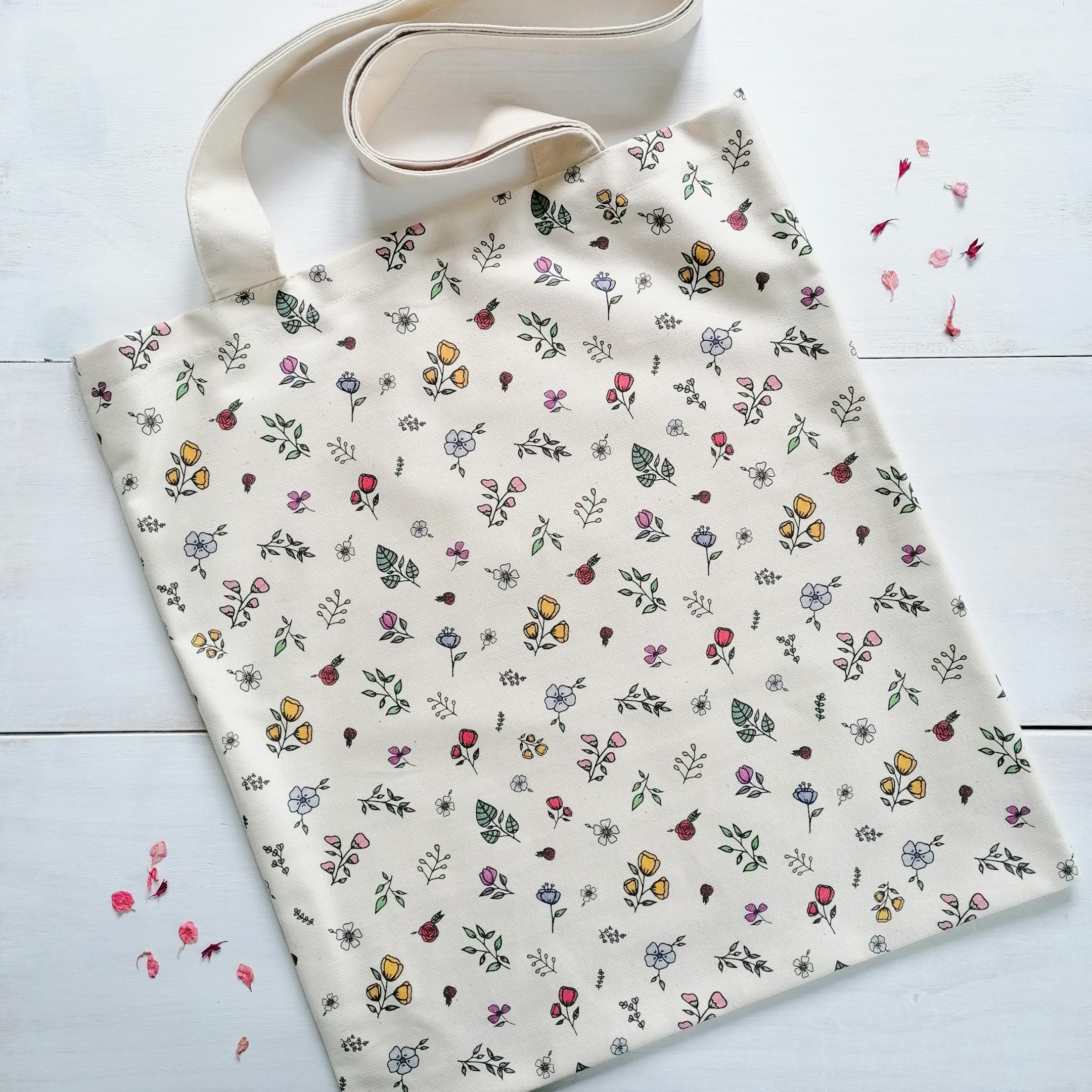 Different designs can be found on the front and back of the bag, with one side containing the floral loved statement and the other with a floral pattern.