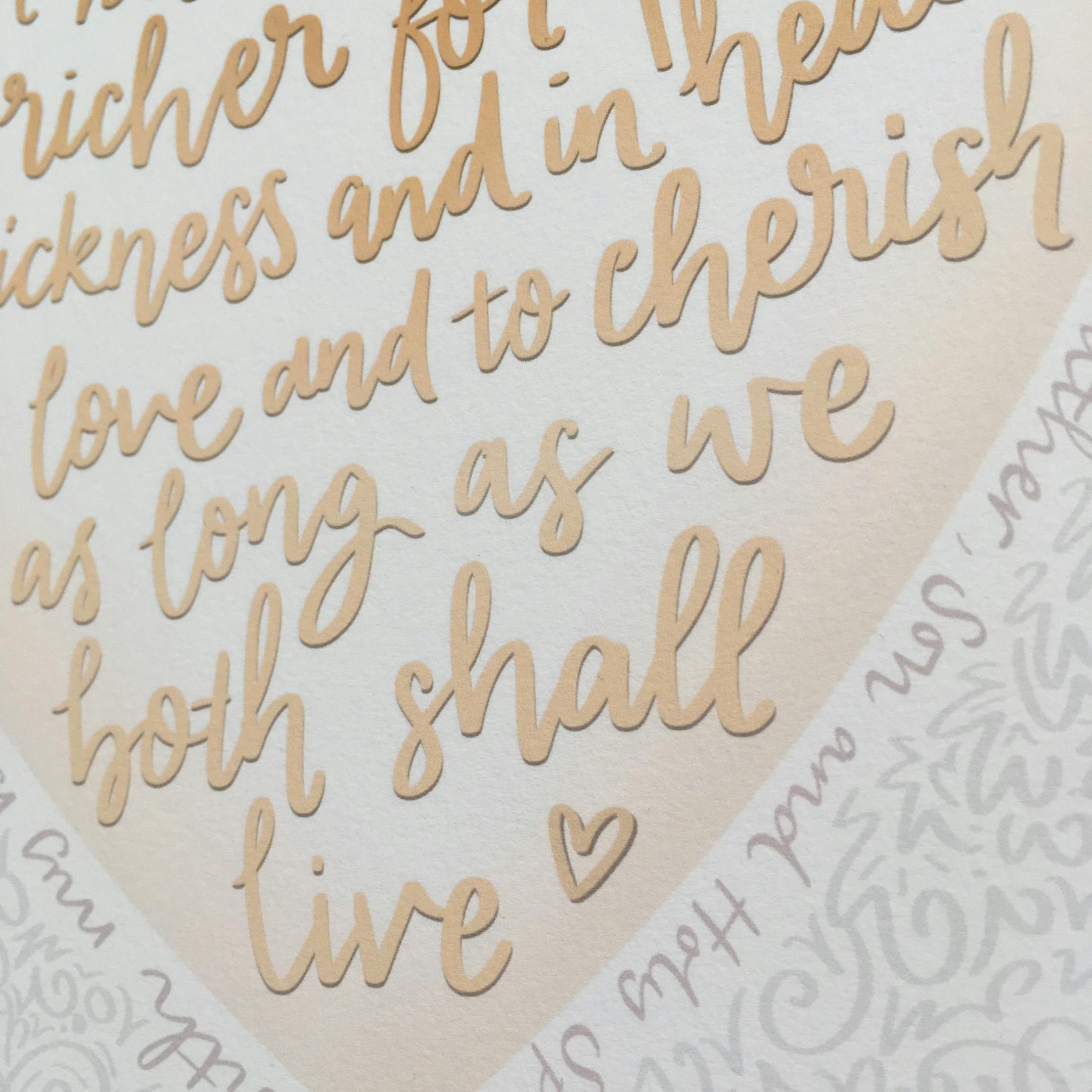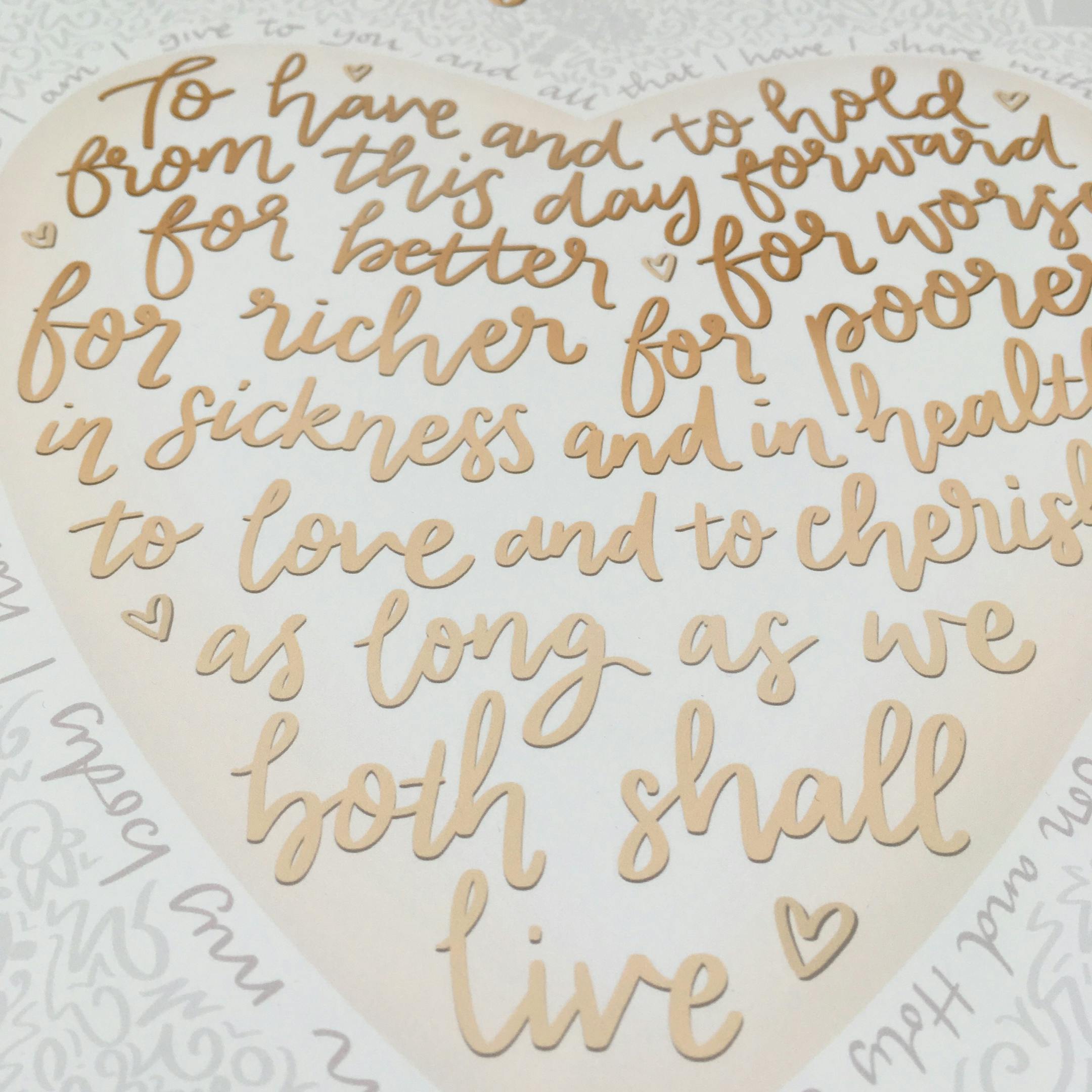 The print comes in gold and silver/grey matte colours and is personalised with the couple’s names and their wedding date. The traditional marriage vows are written inside the shape of a heart, with the words spoken during the giving of rings around the outside. (Exact words noted below.) The doodle background features various images and scriptures associated with a wedding and marriage.