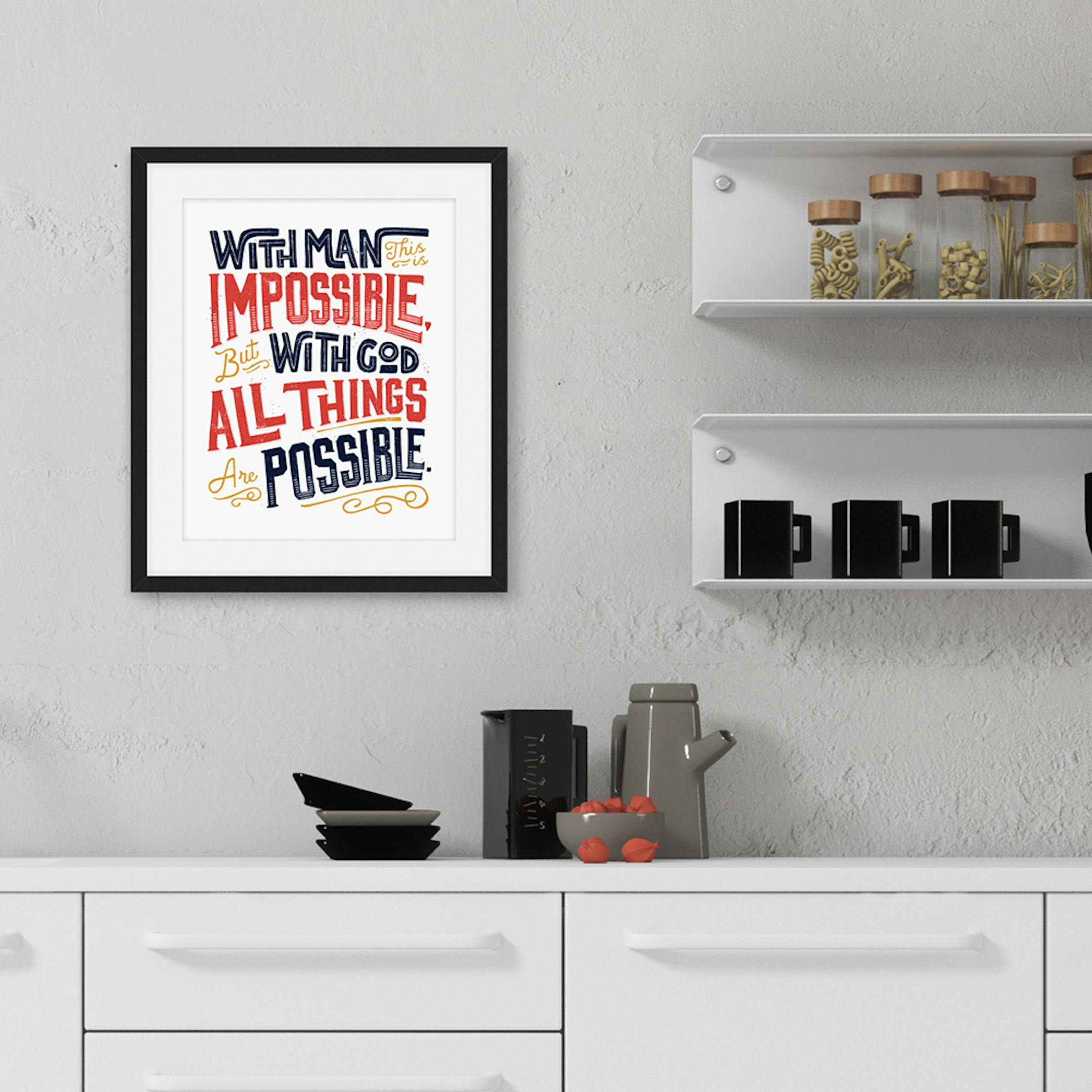 Give this scripture print to someone who needs the reminder of God’s power in their life. The print reads “With Man this is impossible, but with God all things are possible, Matthew 19:26.”