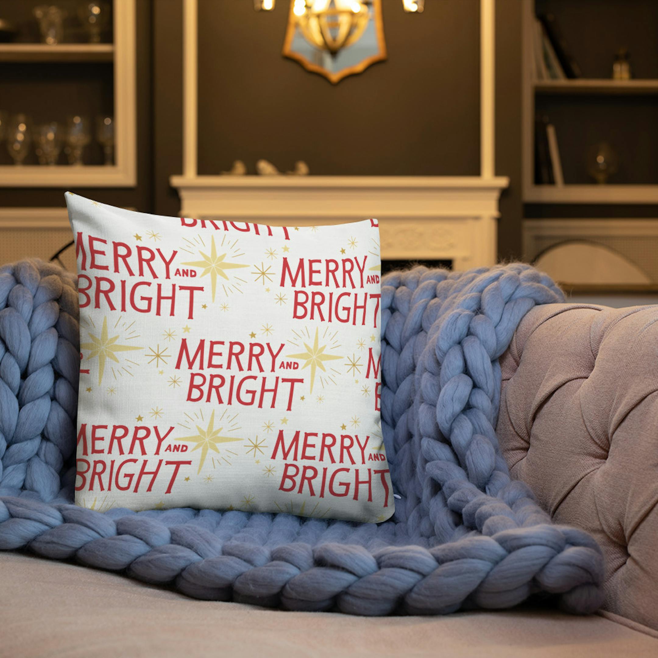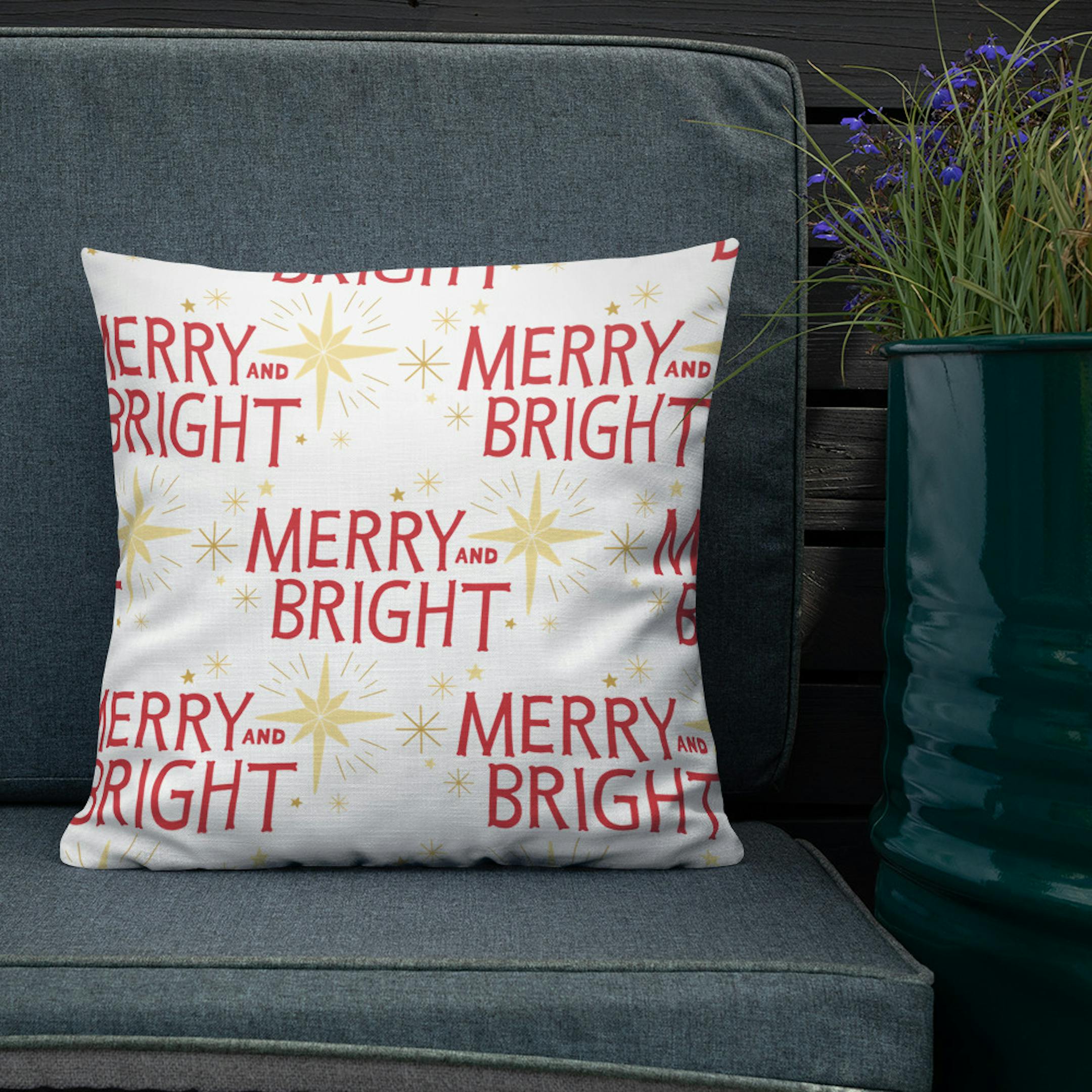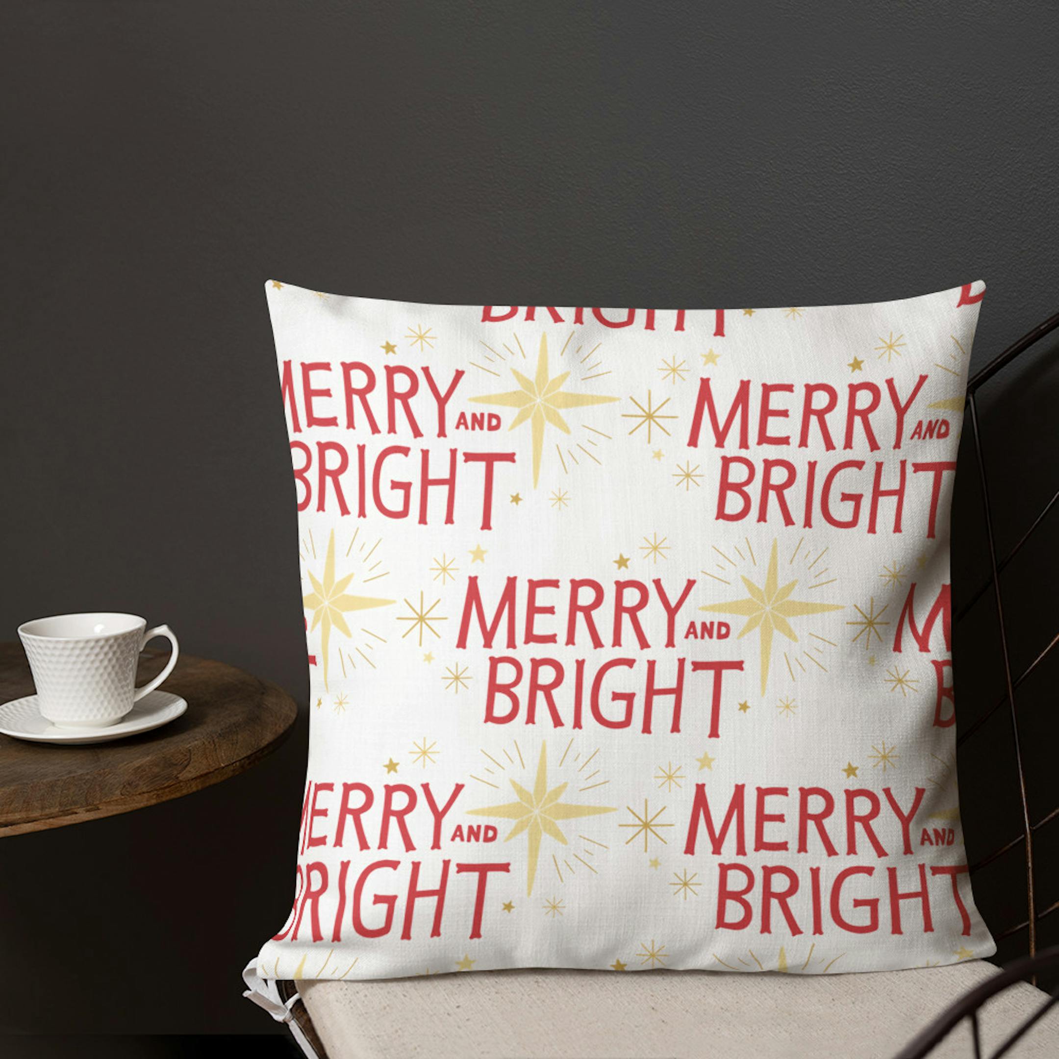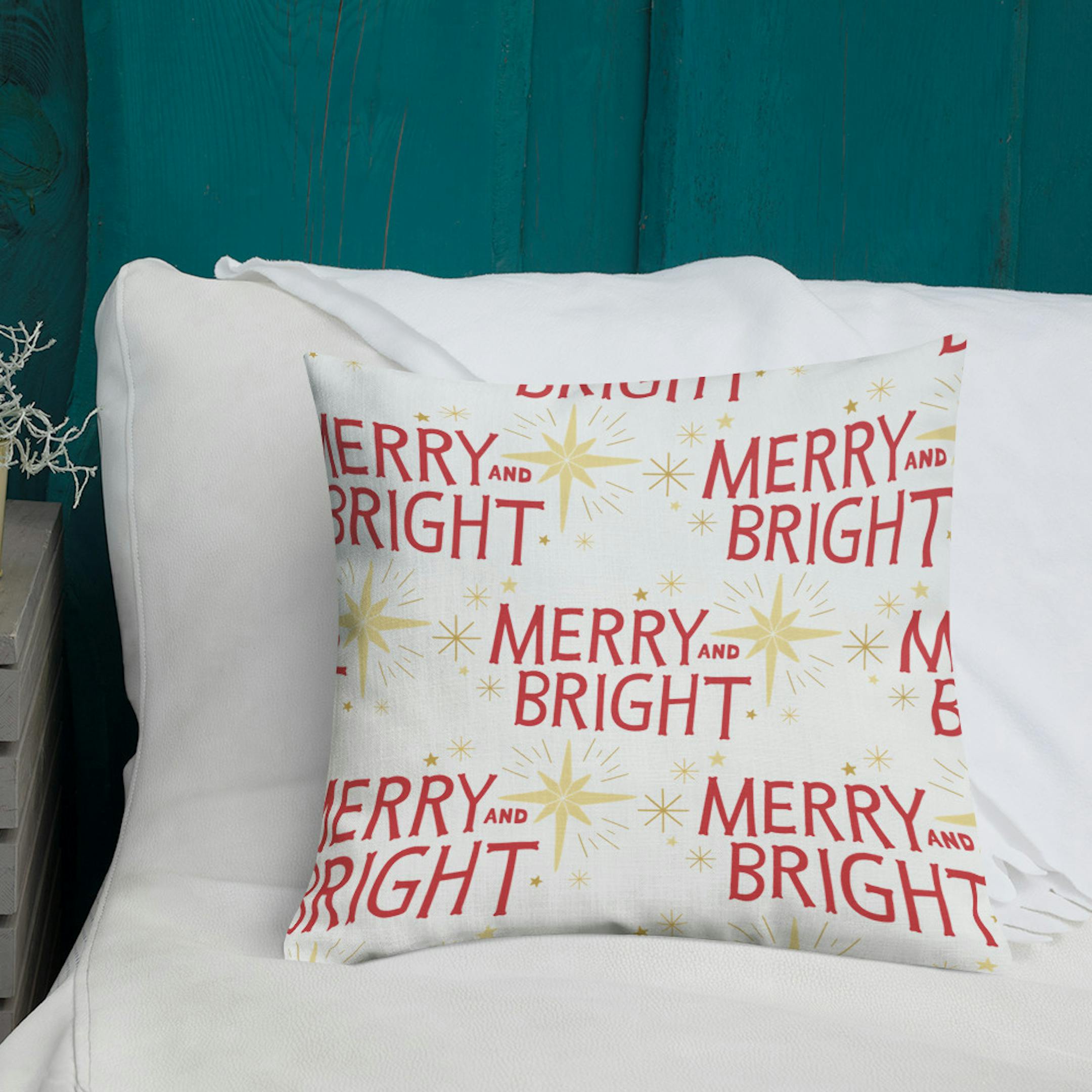 This Christmas cushion celebrates Jesus' birth and the beauty of the season with a pattern of the words merry and bright and the Bethlehem star.