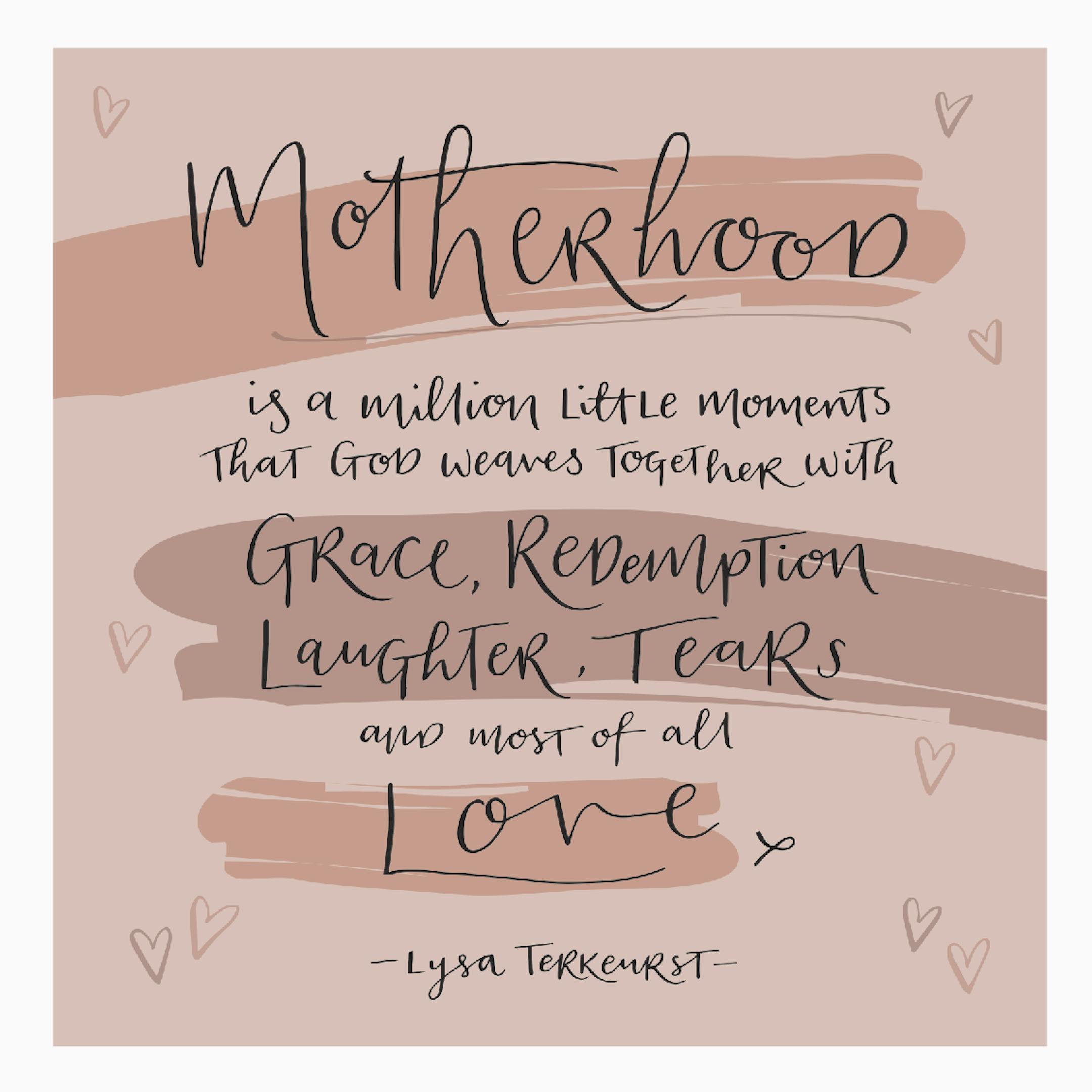 The quote reads 'Motherhood is a million little moments that God weaves together with grace, redemption, laughter, tears and most of all love'.