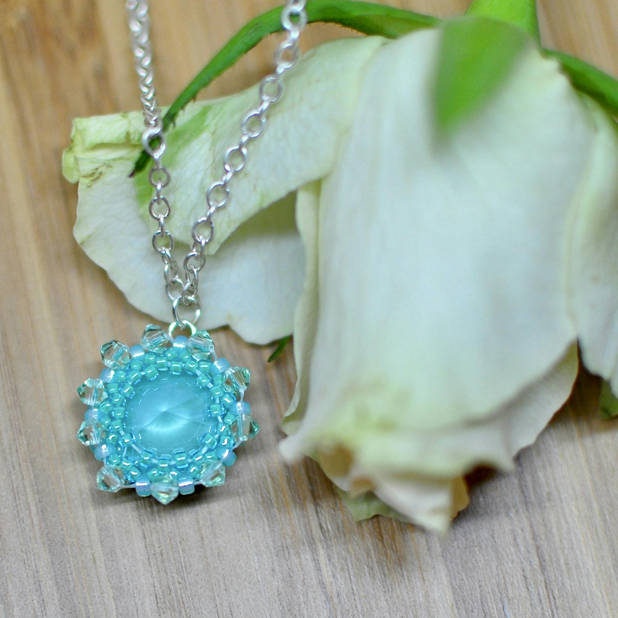 Handsewn together with Japanese glass seed beads and lots of Swarovski crystals (for sparkle!). Necklace chain and findings are quality silver-plated.