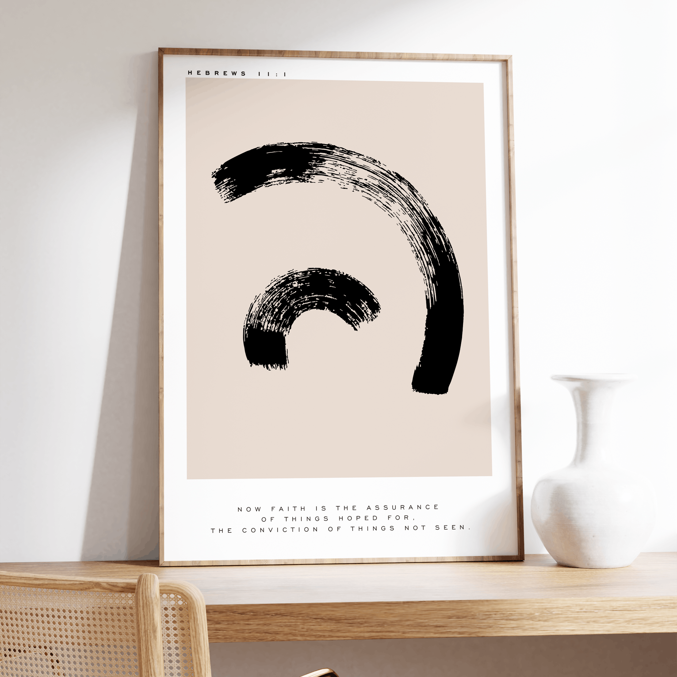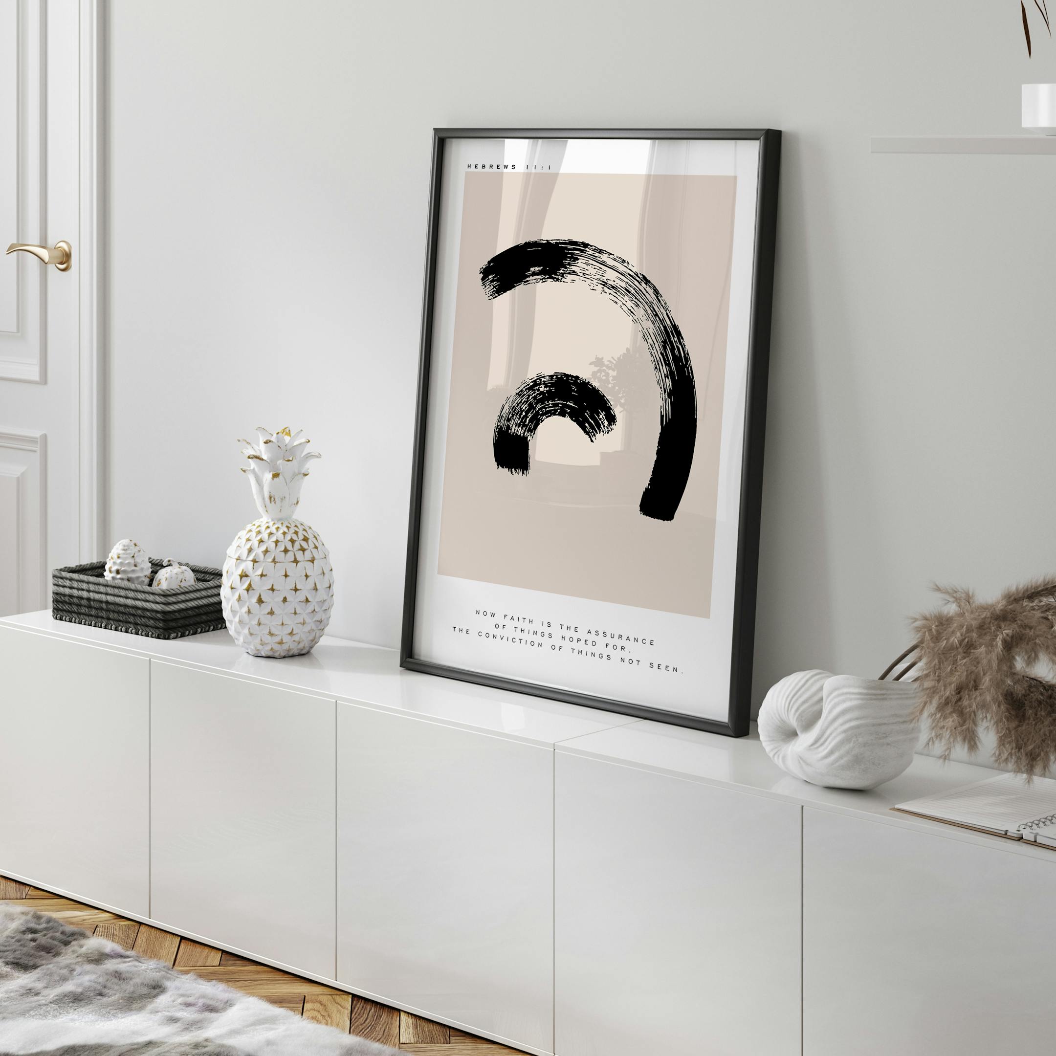 Let the Assurance of Faith Art print be a visual reminder of your faith. This modern black and beige abstract design includes the bible verse from Hebrews 11:1, "Now faith is the assurance of things hoped for, the conviction of things not seen." The simple yet modern christian art makes it easy to decorate any room in your home with a meaningful accent. Place this art print on its own as an eye-catching statement piece or use it alongside other décor for an elegant focal point.