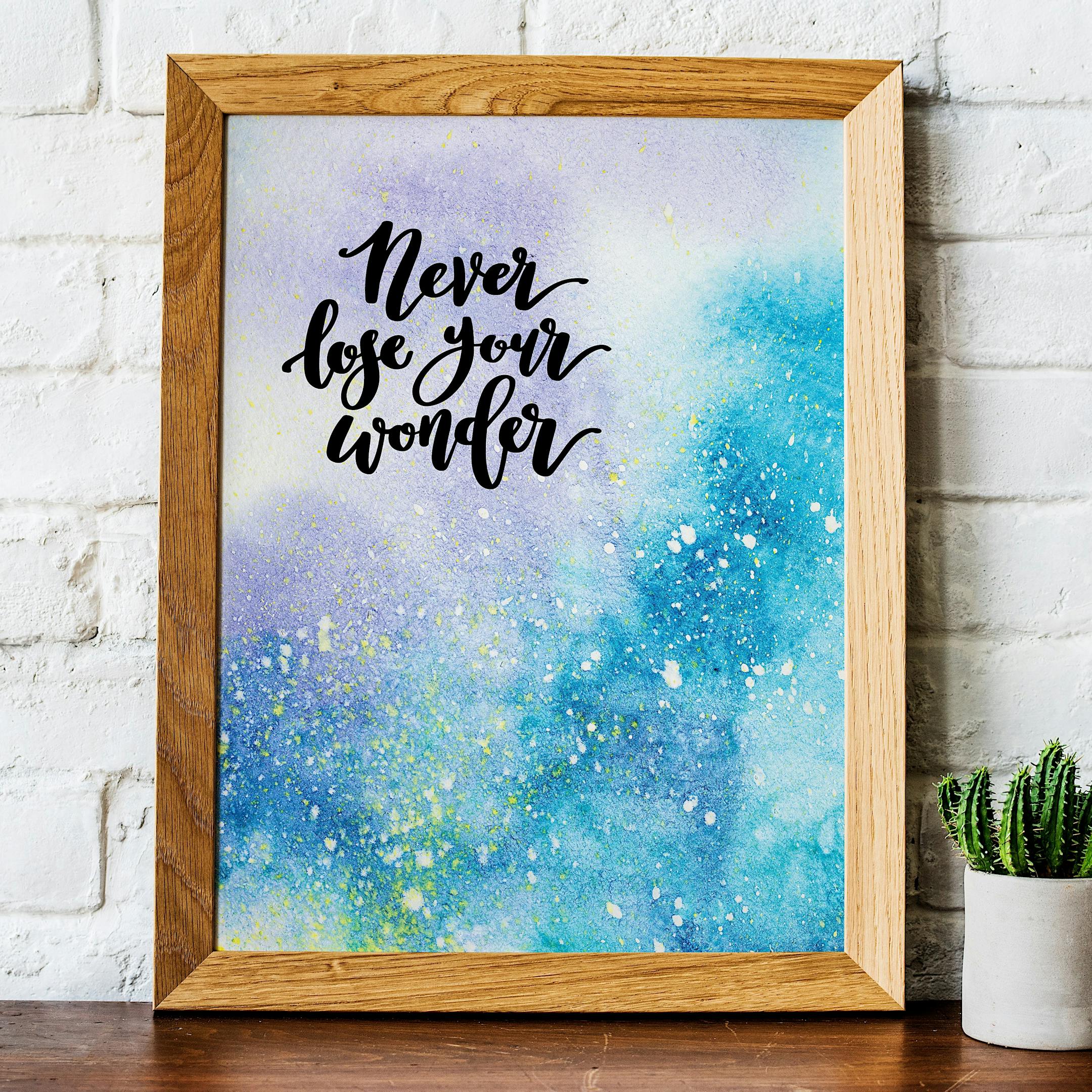 This hand-lettered calligraphy print, features the powerful quote, 'Never Lose Your Wonder Print', complimented by the stunning watercolour backdrop.