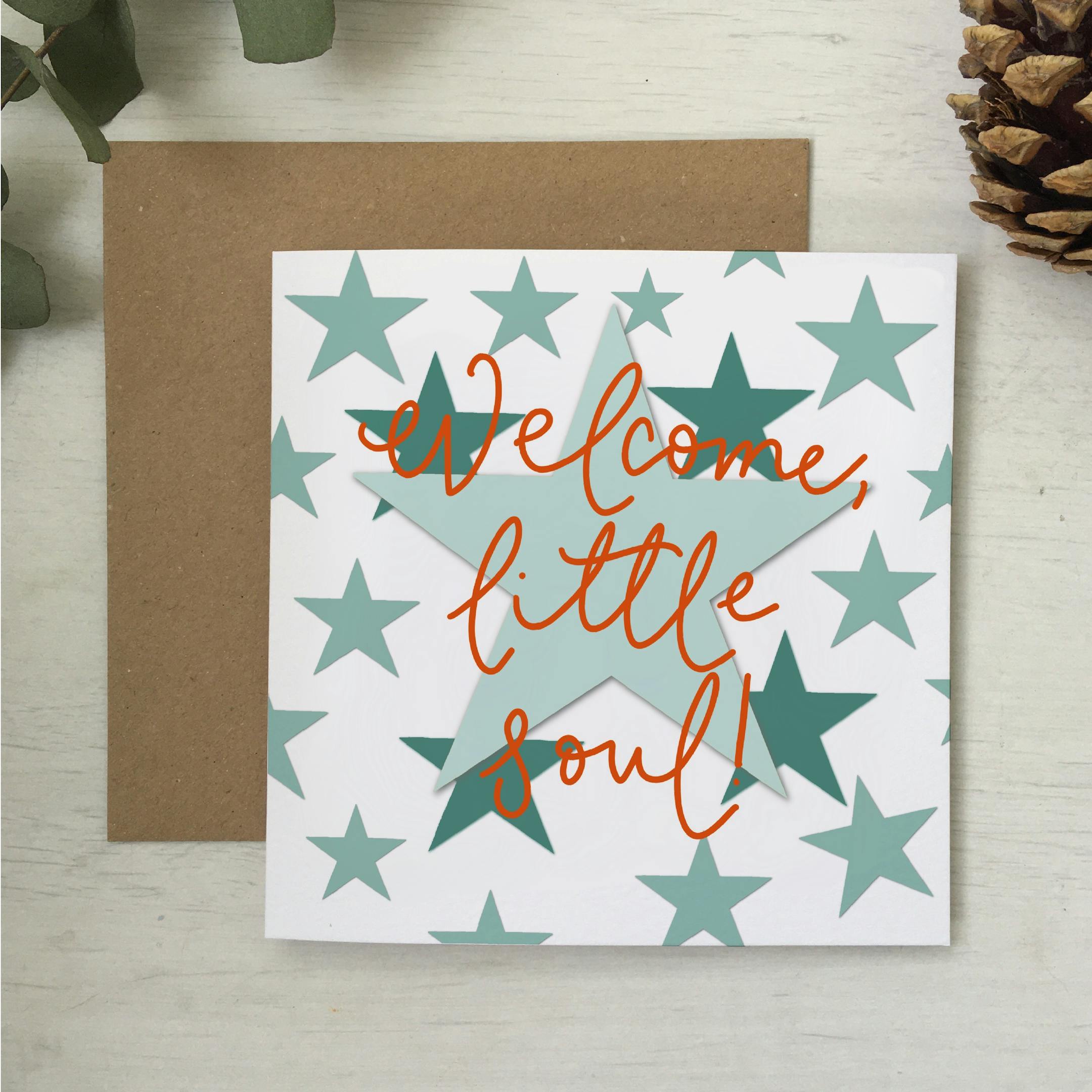 A lovely card featuring mint green and turquoise paper cut stars and the world’s “welcome, little soul!” hand lettered in bright orange over the stars.