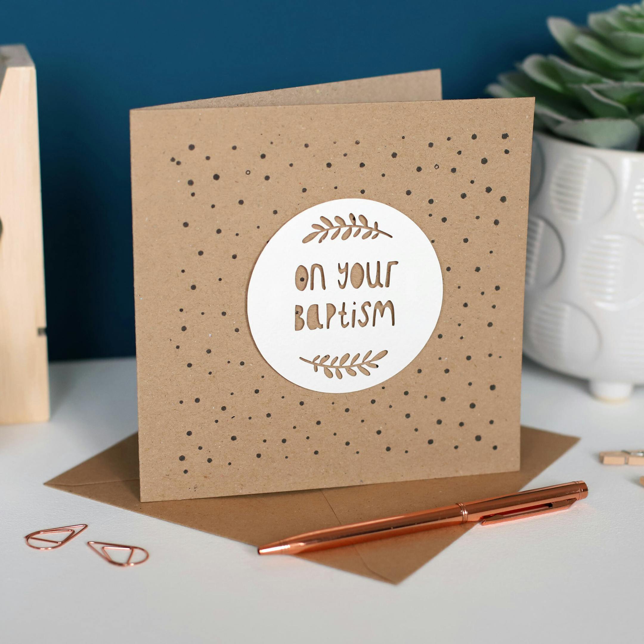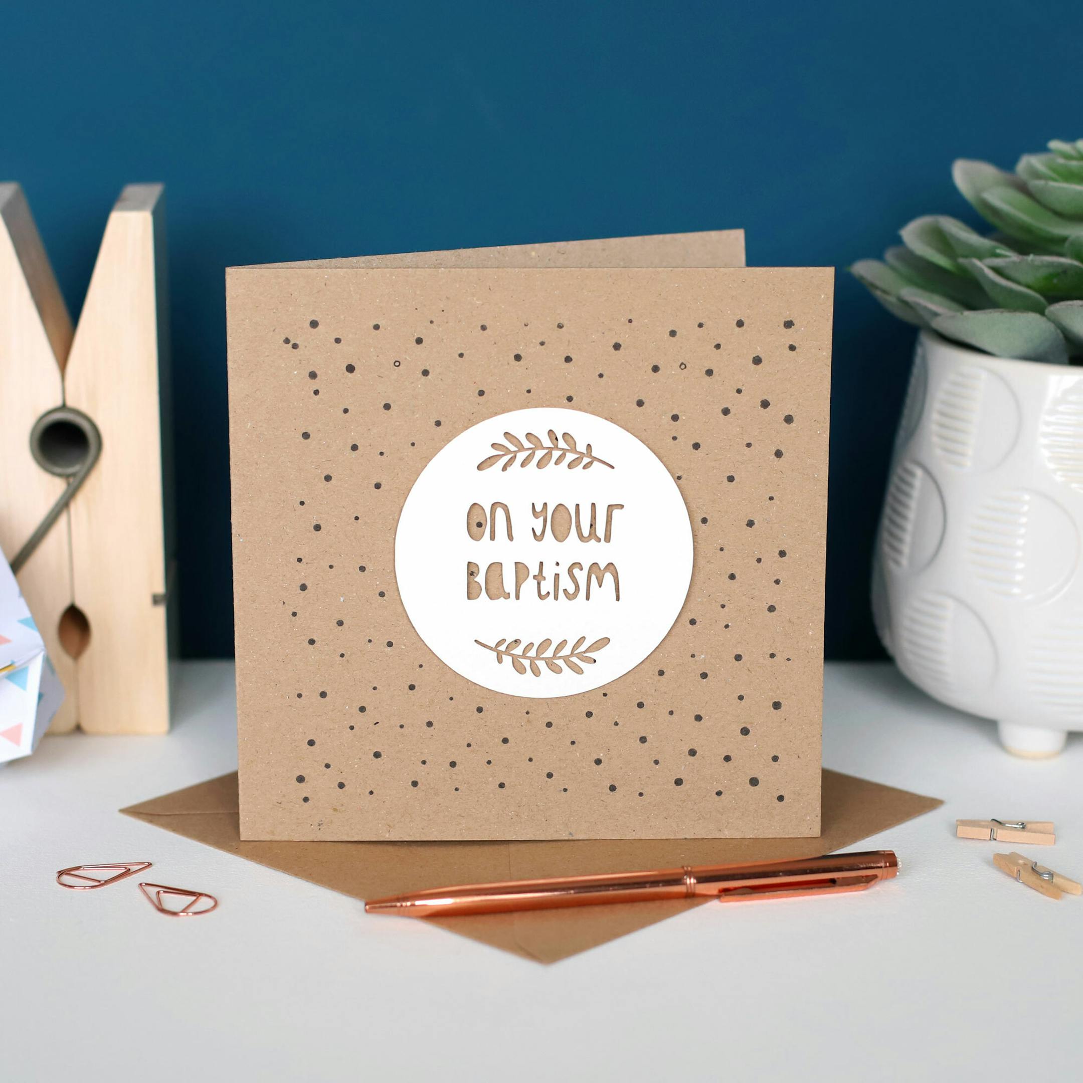 Celebrate the special moment of a Baptism with our 'On Your Baptism' 3D Paper Cut Card. The card features an original paper cut design delicately placed on a Kraft greetings card, adding a 3D effect and depth. The card is finished with a charming hand-stamped dotty background.