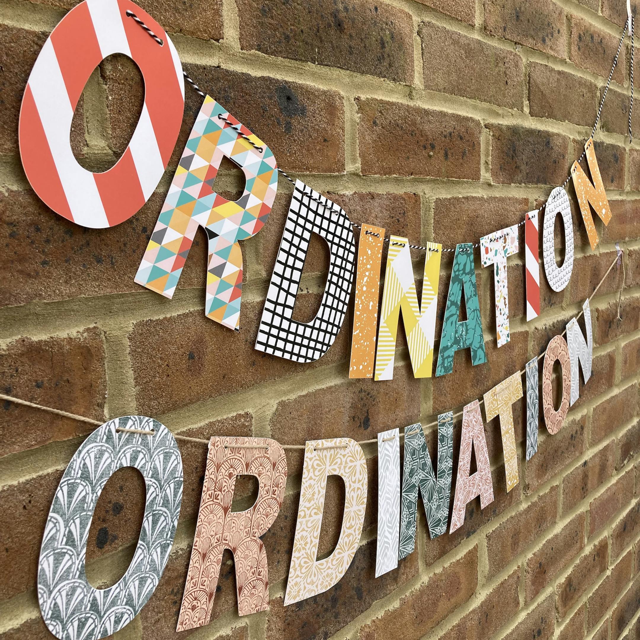 Each set contains 10 letters spelling out the word 'ORDINATION' and each letter is approximately 8 x 12.5 cm in size. The letters are printed and cut from 300gsm silk cardstock so are both vibrant and sturdy.