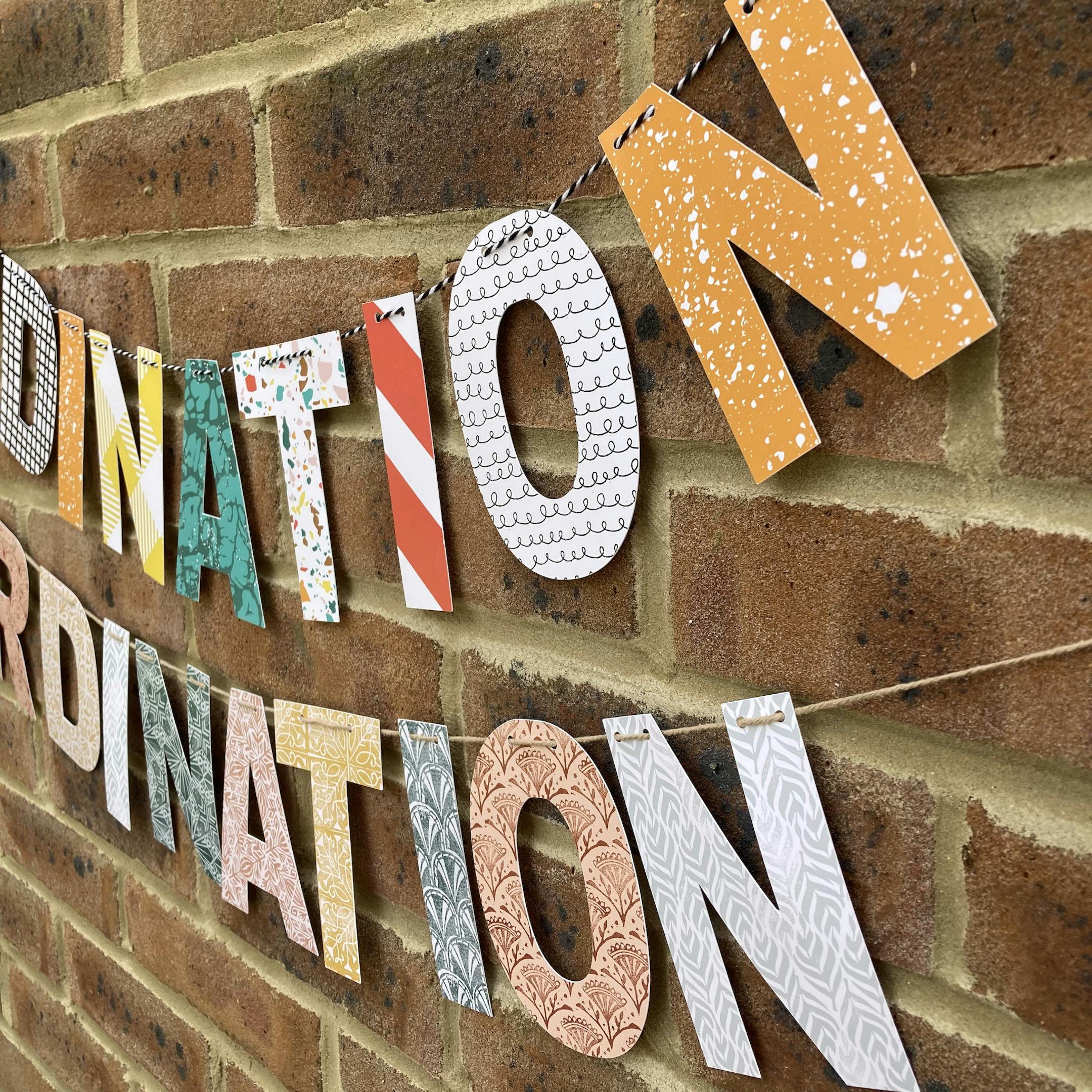 1. Abstract Brights - with playful patterns and pops of colour and black and white bakers twine to hang the letters, and