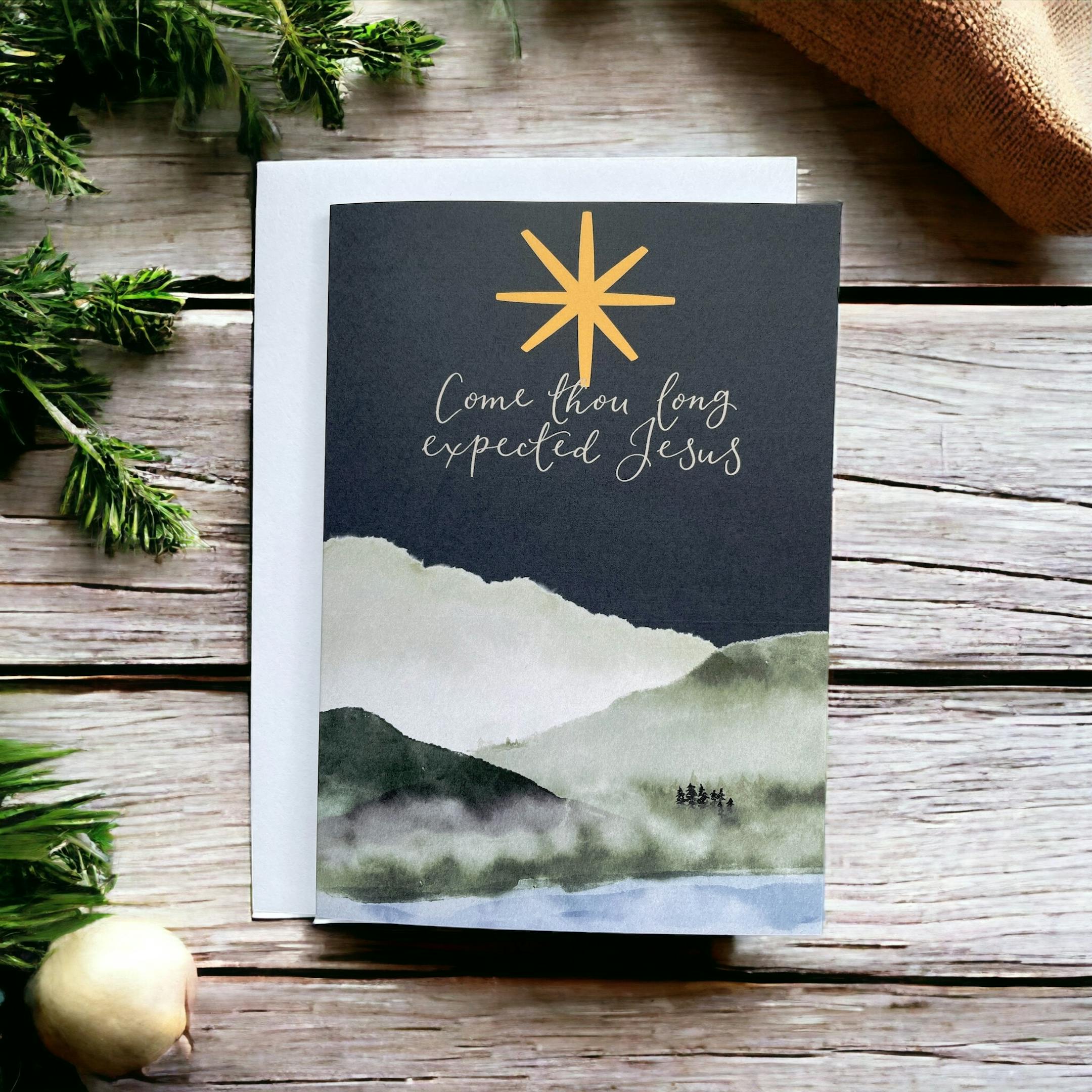 A pack of 5 identical Christmas cards featuring a misty landscape scene, the hand lettered words “come thou long expected Jesus” and a bright yellow star.