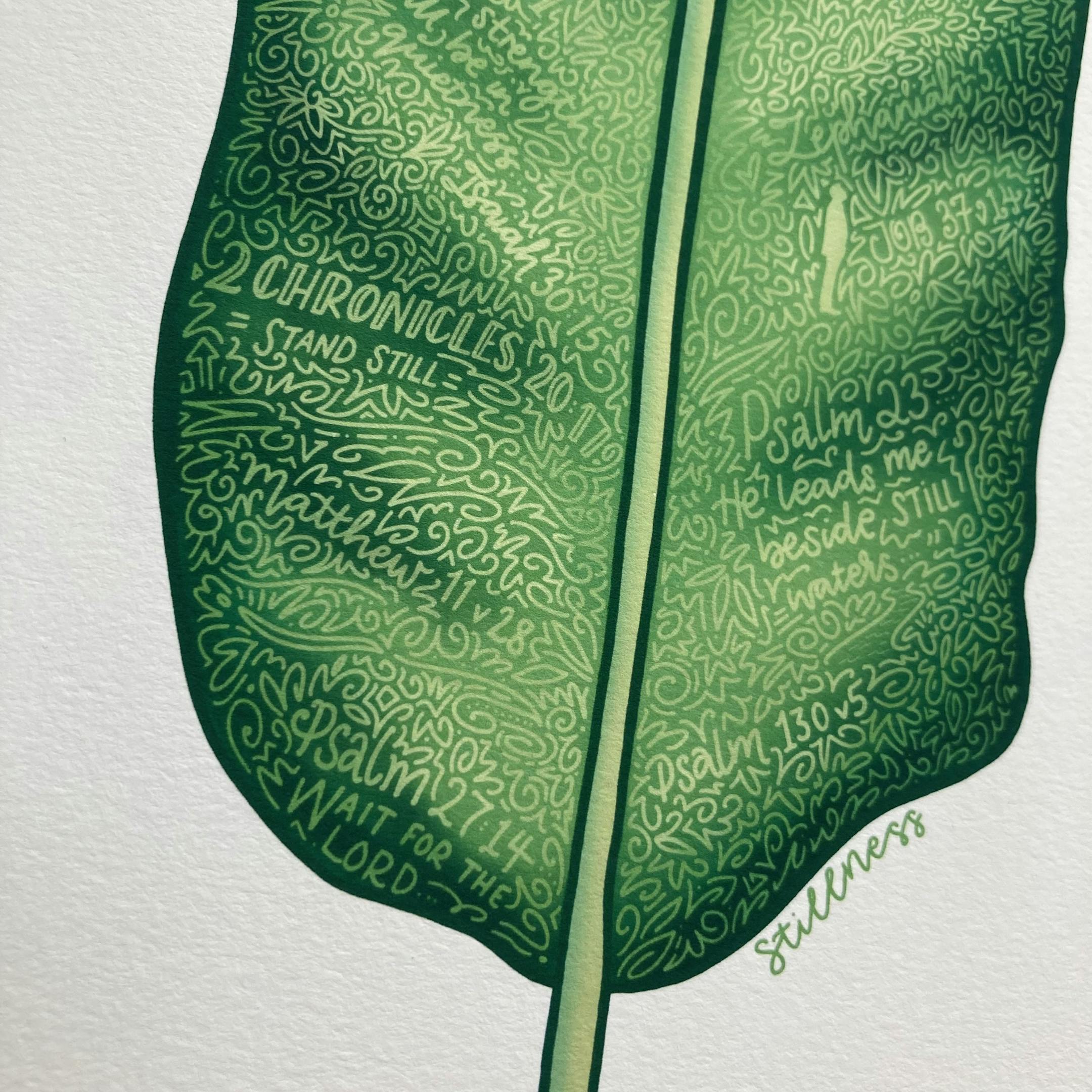 STILLNESS - The straight banana leaf design contains scriptures and images about stillness among the doodles that compose a layer of tone, colour and texture. The word ‘stillness’ is subtly handwritten in cursive on the underside of the leaf.