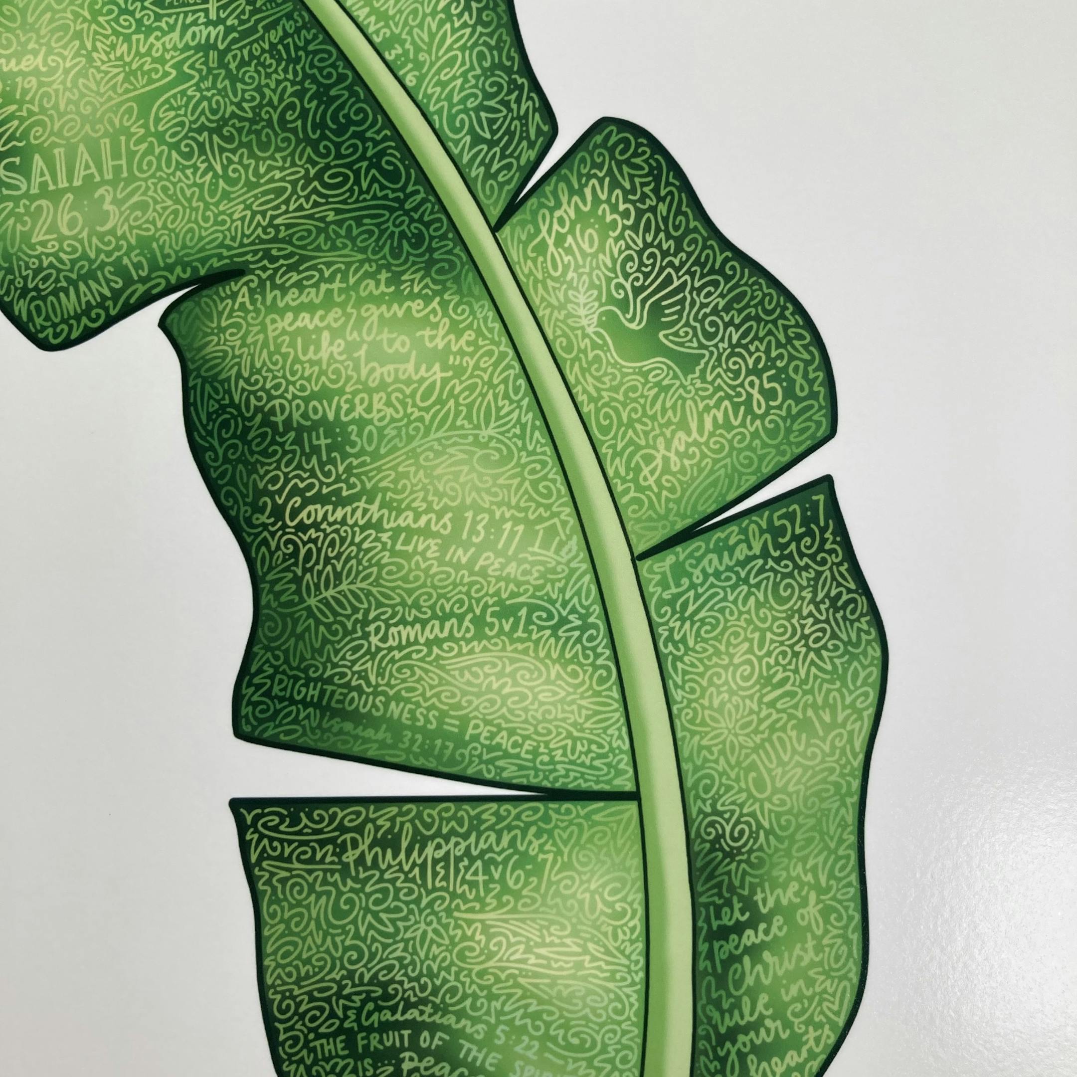 PEACE - The curved banana leaf design contains scriptures and images about peace from both the Old and New Testaments, which are surrounded by my signature doodles. The word ‘peace’ is subtly handwritten in cursive on the underside of the leaf.
