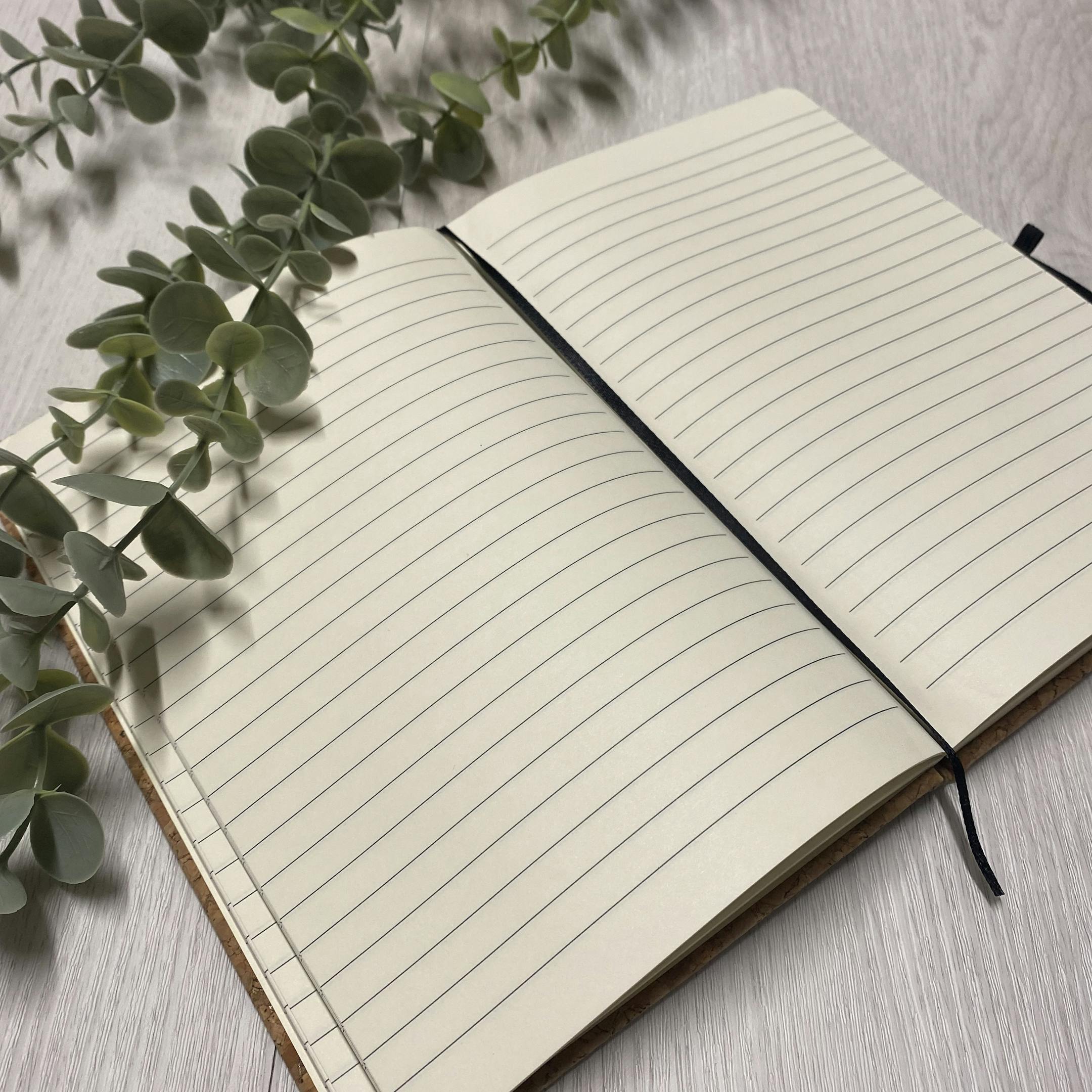 An A5 notebook with lined paper and a soft cork cover, pen loop and elastic band for closure.